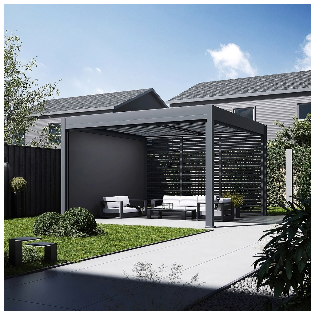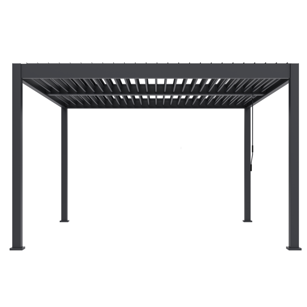 Prémiová samostatná stojaca bioklimatická pergola INTRO DUO z hliníka s rozmermi 4 × 4 metre je ideálnym riešením na zastrešenie vonkajšieho posedenia. Robustná a stabilná konštrukcia v antracitovej farbe RAL 7016 s matnou povrchovou úpravou sa hodí do akéhokoľvek exteriéru. Nie je potrebné ju kotviť do steny, vďaka čomu ponúka väčšiu flexibilitu pri umiestnení. Pergola je vyrobená z kvalitného hliníka práškovou farbou, čo zaručuje odolnosť voči poveternostným vplyvom. Pergola navyše umožňuje jednoduchú ventiláciu priestoru, čo zaisťuje príjemnú cirkuláciu vzduchu počas teplých dní. A keď príde dážď, pergola sa postará o to, že vaše vonkajšie posedenie bude aj naďalej suché - poskytne vám dokonalý prístrešok, ktorý chráni nielen pred dažďom, ale aj pred vetrom.