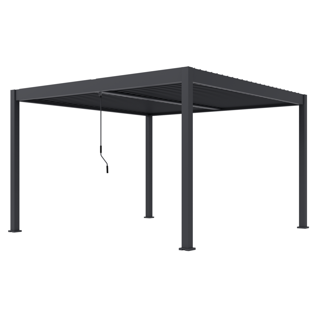 Lamely sú rozdelené do dvoch samostatne ovládateľných zón , čo umožňuje nastaviť ich polohu podľa vašich potrieb. Celkovo 50 otočných lamiel poskytuje účinnú ochranu nielen pred slnkom, ale aj pred dažďom. Možno ich nakláňať v rozmedzí od 0° (úplne uzavretá strecha) až do 135°, vďaka čomu si môžete prispôsobiť tienenie a regulovať množstvo svetla z rôznych uhlov. Ovládanie je manuálne, a to pomocou kľučky, ktorá je navrhnutá tak, aby ovládala jednoduchú konštrukciu a plynulú manipuláciu bez rizika poškriabania. Kľučka je umiestnená tak, aby neprekážala pri montáži bočných zásten alebo panelov a v prípade potreby ju možno odstrániť.