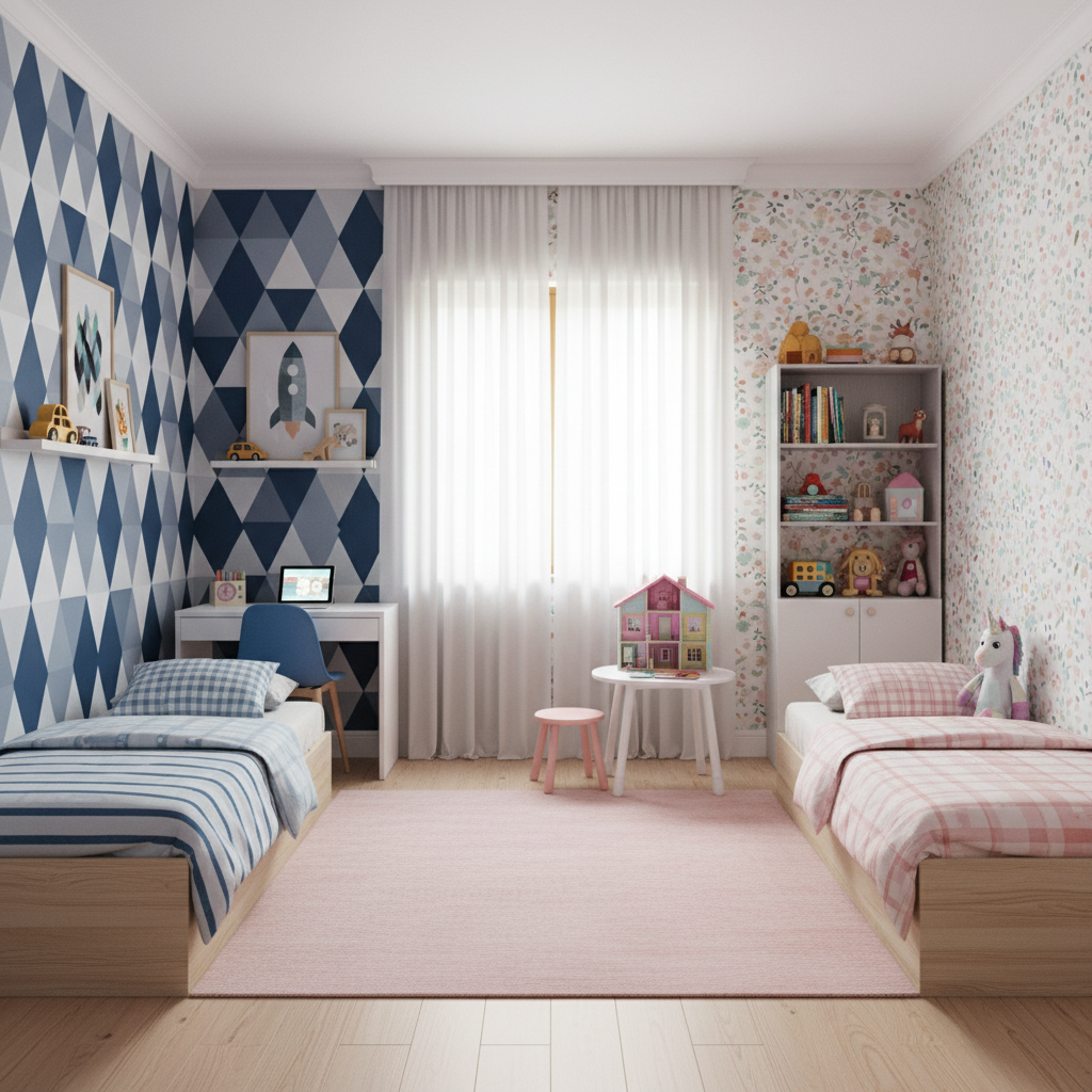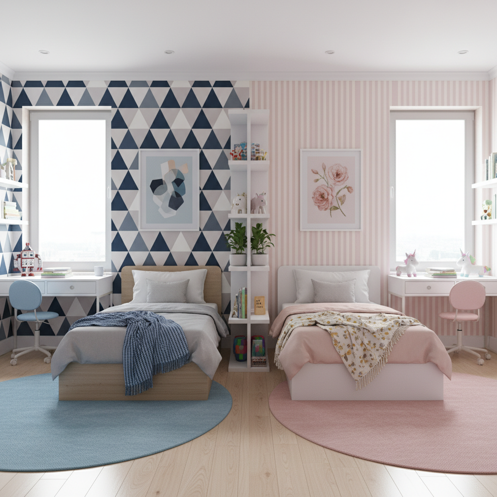 Jednoduchým spôsobom, ako vizuálne oddeliť jednotlivé zóny v izbe, je použitie rôznych farieb. Steny môžete vymaľovať v odlišných odtieňoch alebo doplniť tapetami a vzormi, ktoré vytvoria samostatné „svety“ zodpovedajúce vkusu každého dieťaťa. Zaujímavým riešením je aj nábytok v dvoch ladiacich farebných kombináciách – napríklad kašmír s púdrovou ružovou, biela s drevom či zelená so sivou.
