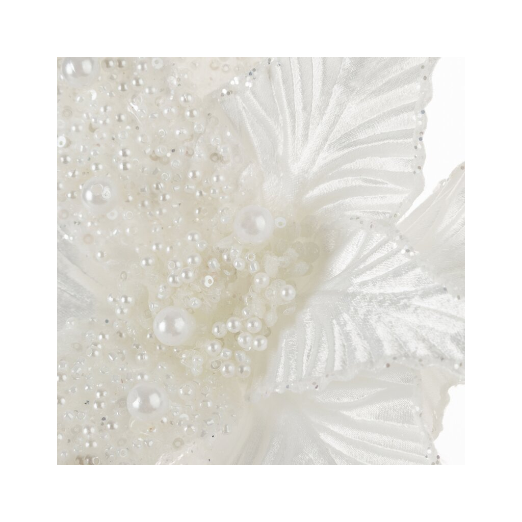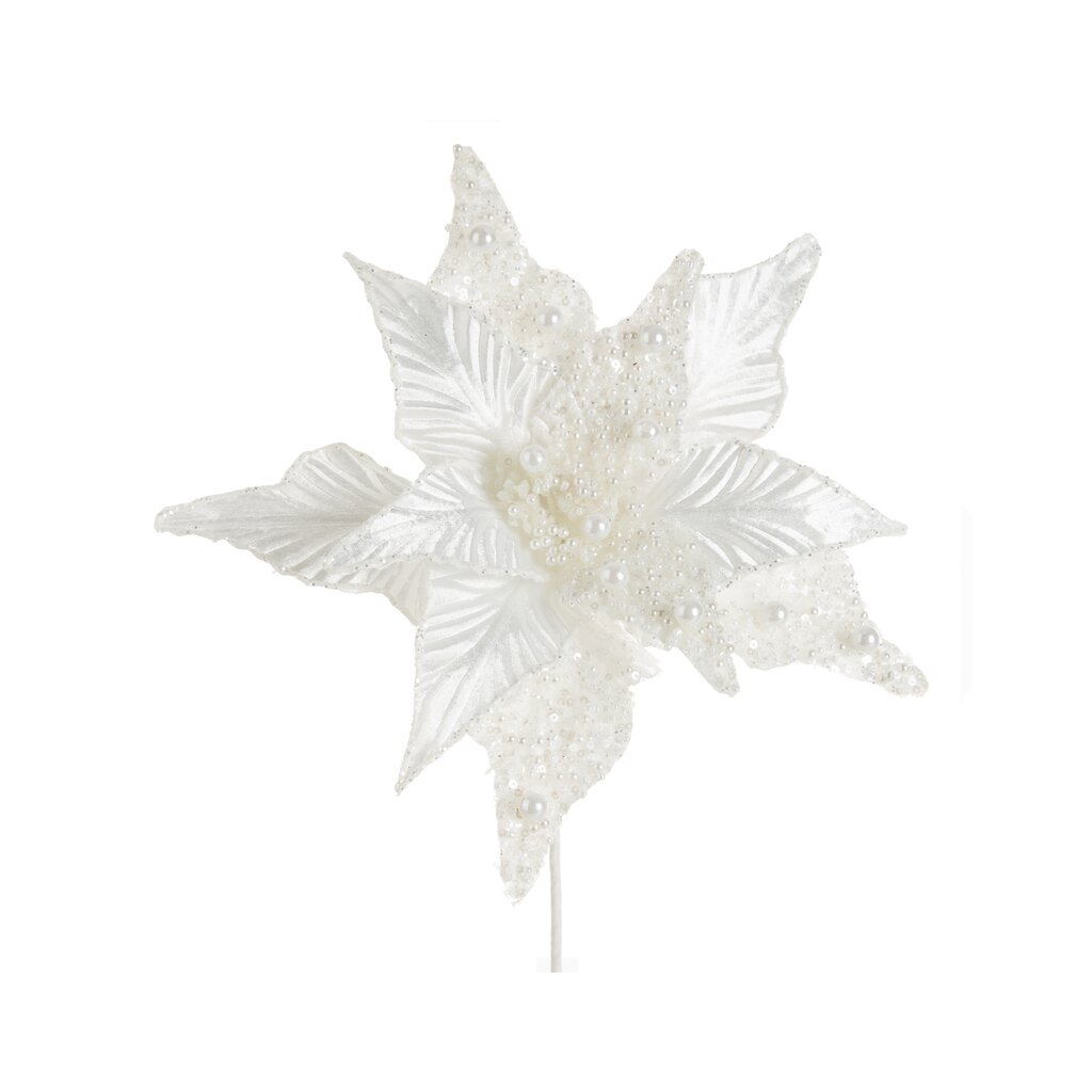 Vianočný dekoračný kvet. šírka: 30 cm, dĺžka: 40 cm, farba: biela, zloženie: Materiál: 100% polyester. Cena je uvedená za 1 kus. Minimálne objednateľné množstvo 12 ks. Možno objednať iba násobky čísla 12. Napr. 12, 24 atď.