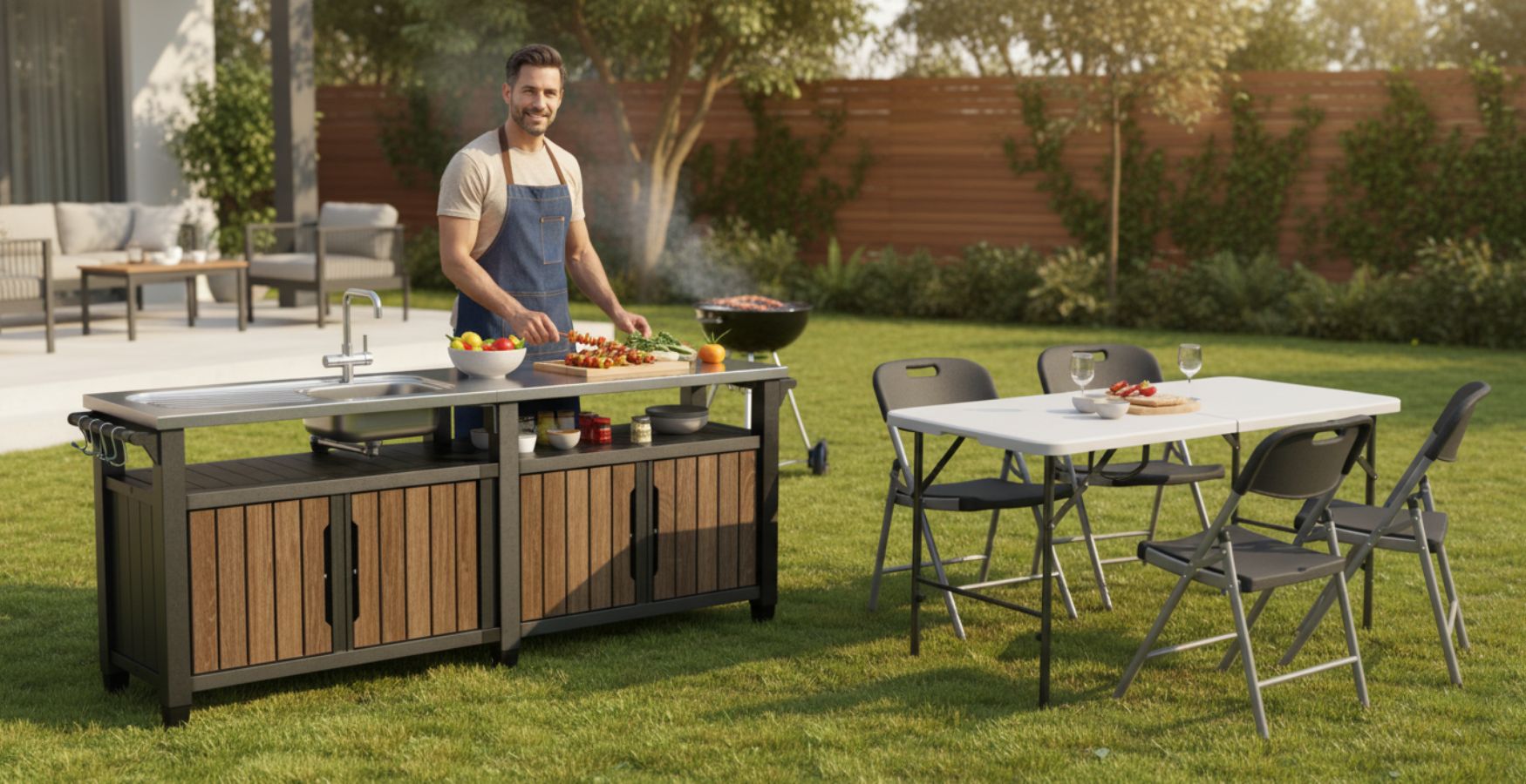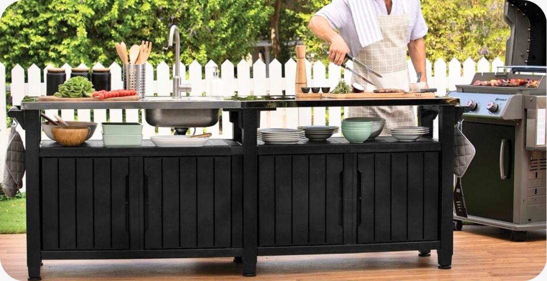 Mobilné stoly s úložným priestorom, ktoré sú vybavené nerezovou pracovnou dosku a umývadlom, sú výborným nábytkovým prírastkom do vašej letnej kuchyne. Oceníte ich najmä pri záhradných grilovačkách a oslavách: všetko potrebné kuchynské náčinie aj pracovnú plochu budete mať poruke a nebudete musieť neustále odbiehať od grilu do kuchyne v dome.