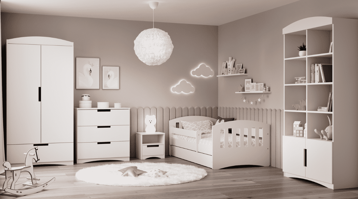 Detská izba CLASSIC predstavuje dokonalú rovnováhu medzi estetikou, funkčnosťou a bezpečím. Je navrhnutá tak, aby rástla spolu s vaším dieťaťom a vytvárala mu prostredie, v ktorom sa bude cítiť pokojne, šťastne a tvorivo. Jemná biela farba v kombinácii s čistými líniami a minimalistickým dizajnom pôsobí elegantne, neutrálne a ľahko sa kombinuje s akýmkoľvek štýlom doplnkov. Je navrhnutá tak, aby ju bolo možné ľahko prispôsobiť meniacim sa potrebám dieťaťa – od batoliat až po školákov. Jednoduchý dizajn umožňuje dopĺňať nové doplnky, meniť farby stien alebo textílie bez toho, aby bolo nutné meniť celý nábytok.