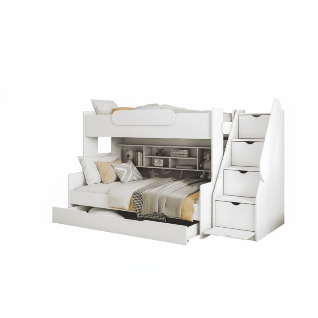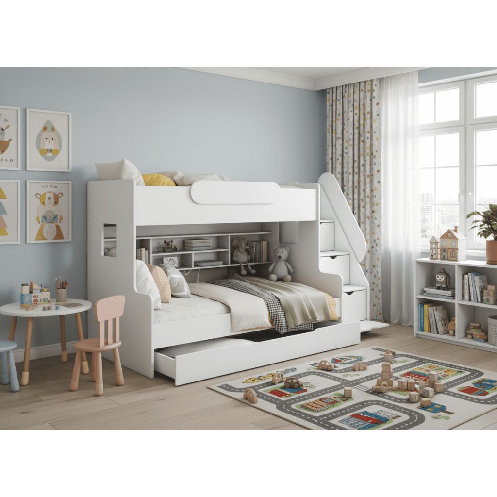Multifunkčná posteľ SEGAN s úložným priestorom pod posteľou i v schodíkoch je vhodná do každej detskej alebo študentskej izby. Vyberte si z ponuky nábytku pre deti, ktorý vďaka unikátnej konštrukcii v kombinácii s modernosťou ohromí každé dieťa. Svojou krásou a rozmanitosťou, ktorá sa vyznačuje jedinečným a roztomilým čarom očarí i dospelých. K posteli je možné doobjednať matrace, rošty sú v cene. Schody je možné umiestniť na pravú aj ľavú stranu. Neutrálna biela farba je vhodná do každej detskej izby.