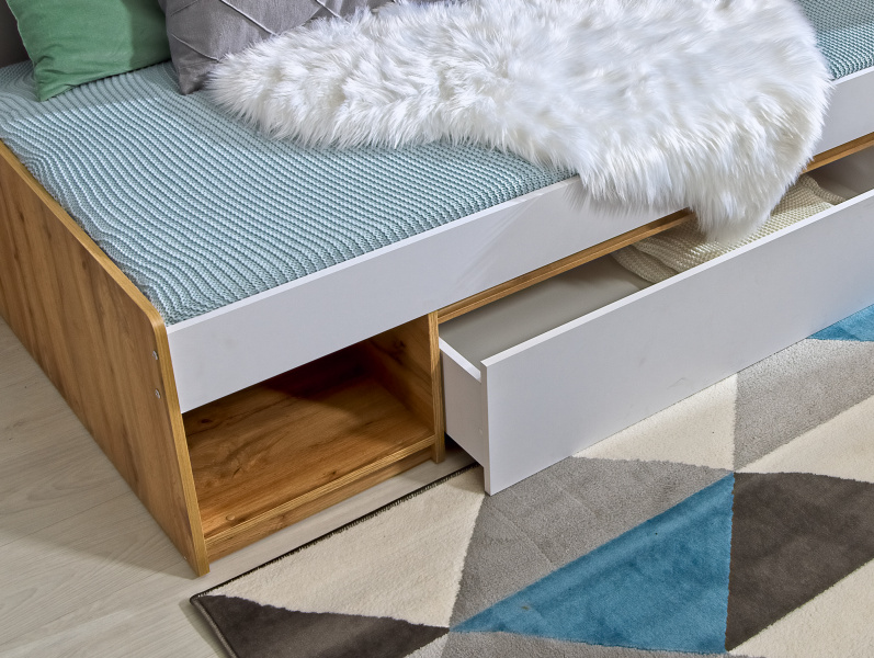 Detská posteľ Archa AR9 je ideálnou voľbou pre každú detskú izbu v dvoch farebných prevedeniach biela a dub Wotan/biela. Tento nábytok prináša do izby teplo prírodného materiálu a možnosť vybrať si farebný odtieň, ktorý najlepšie zapadne do vášho interiéru. Praktickosť postele Archa je umocnená úložným priestorom vo forme zásuvky na uloženie posteľnej bielizne, hračiek alebo iných vec. Nakoľko je úložný priestor obojstranný, možno ho namontovať aj z pravej, aj z ľavej strany. Okrem toho, posteľ disponuje dvoma praktickými policami na odkladanie rôznych predmetov, čo zvyšuje jej funkčnosť a uľahčuje organizáciu priestoru. Posteľ je dodávaná s kvalitným lamelovým roštom, ktorý zabezpečuje optimálnu podporu a pohodlie počas spánku. Matrac nie je súčasťou balenia.