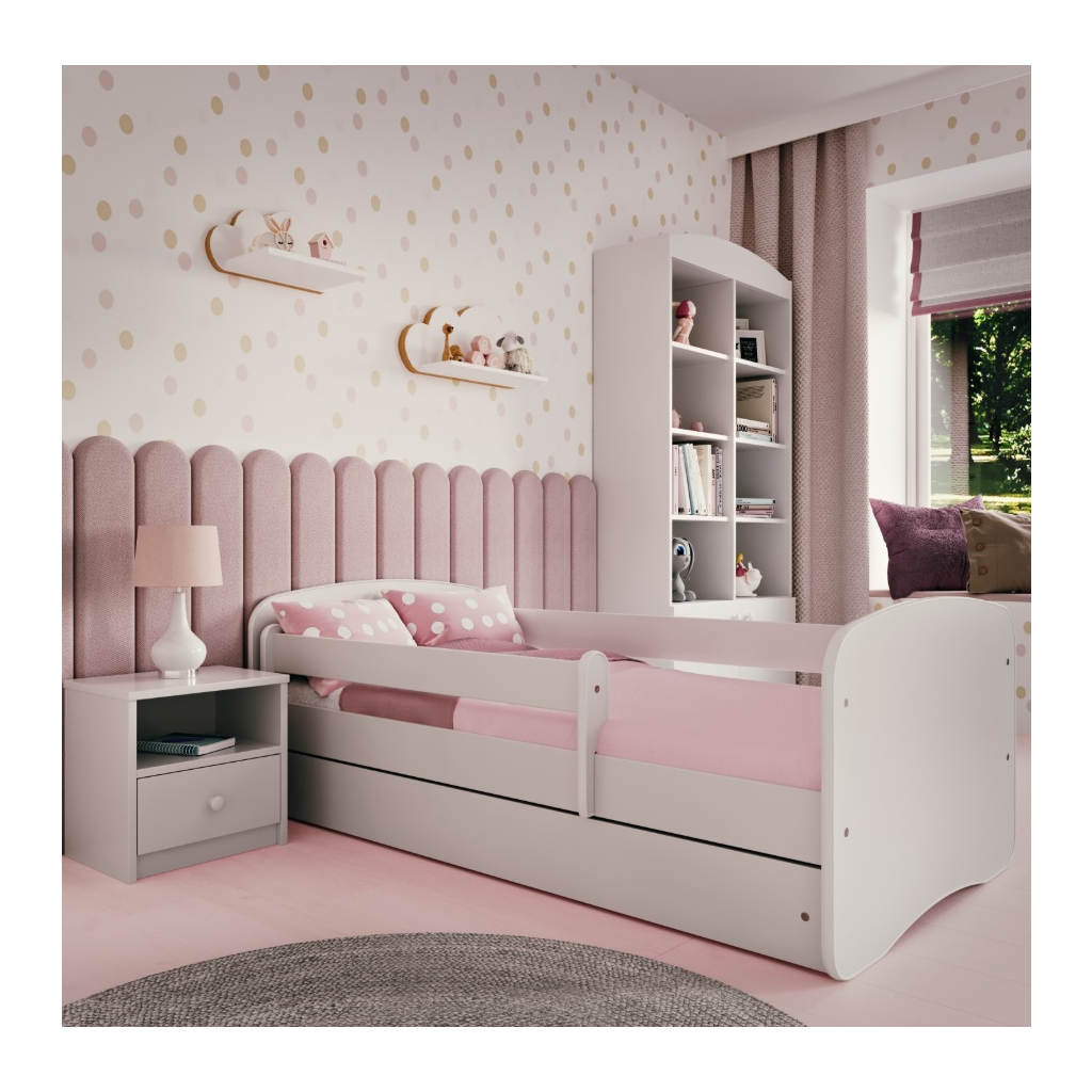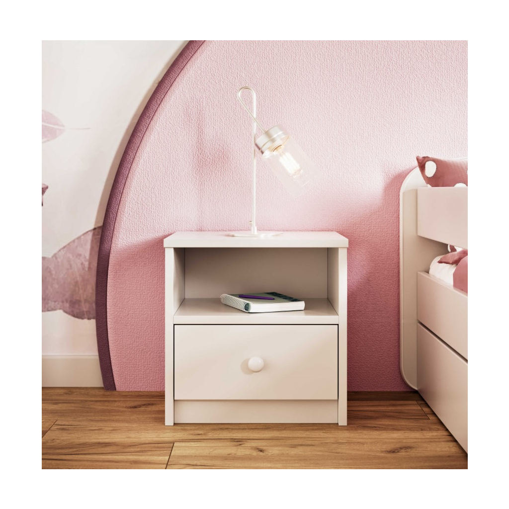 Nočný stolík BABYDREAMS je stvorený pre menšie deti, ktoré majú rady moderný, no zároveň univerzálny štýl. Nadčasové biele prevedenie pôsobí vždy elegantne a ľahko sa kombinuje s akýmkoľvek interiérom. Vďaka svojmu univerzálnemu dizajnu sa nábytok hodí do farebnej, hravej izby, ale rovnako dobre vynikne aj v jednoduchšom, minimalistickom priestore. Štýl celej zostavy zaujímavo spája modernosť s jemným dotykom tradície, čím vytvára harmonické a útulné prostredie pre vaše dieťa. Praktický biely nočný stolík s jednou zásuvkou a otvorenou policou.