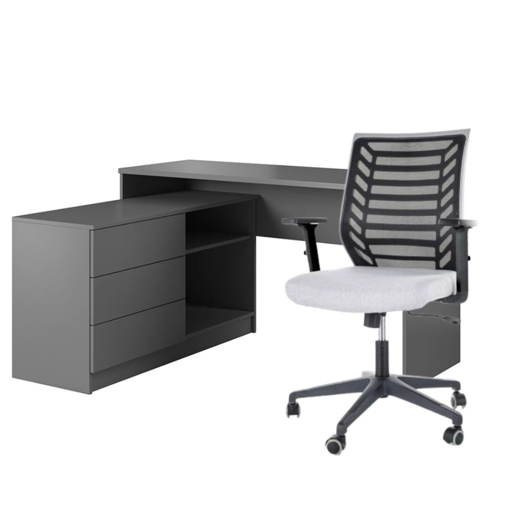 Štýlový písací stolík so skrinkou TEODOR je vyrobený z kvalitnej DTD s ABS hranami. Materiál je kvalitný, nevyžaduje špeciálnu starostlivosť. Moderná kancelárska stolička Q-320R má plastový kríž a opierky. Sedadlo je čalúnené látkou, operadlo sieťkou, vďaka čomu je operadlo priedušné.