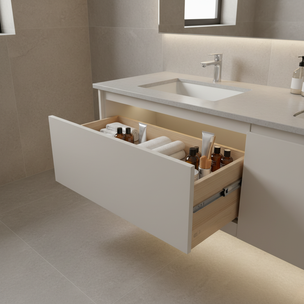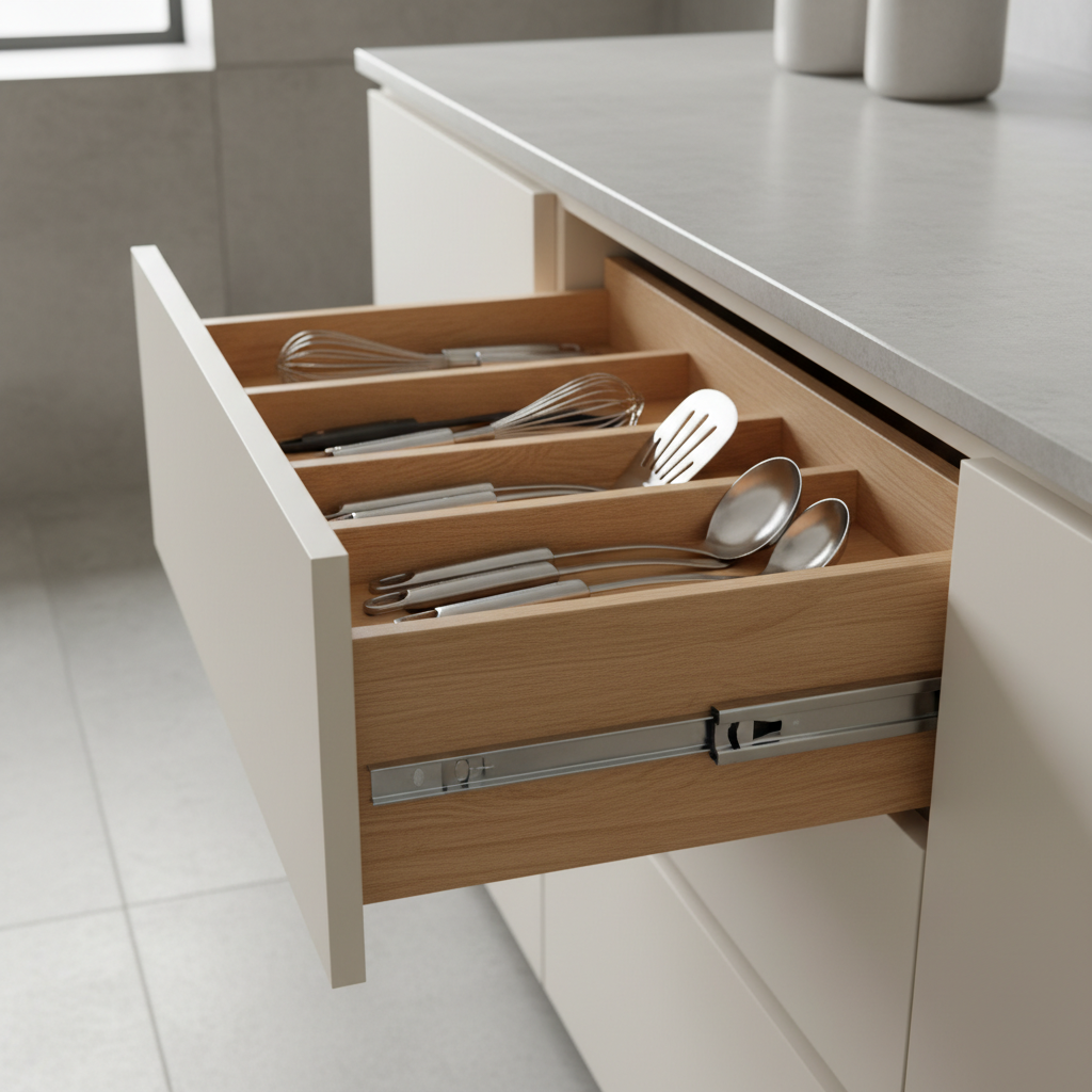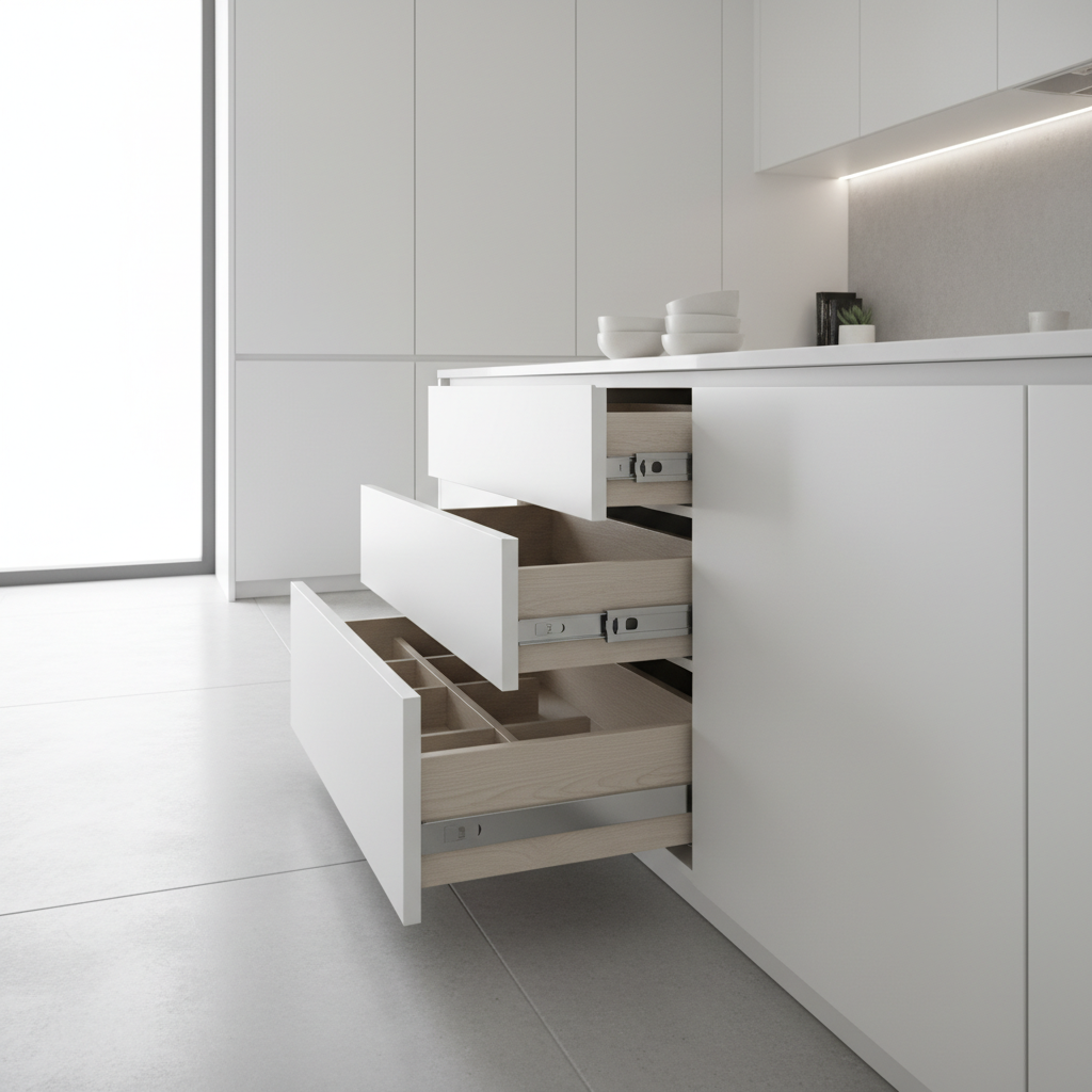 Plno výsuvné zásuvky umožňujú úplné vysunutie zásuvky, vďaka čomu máte pohodlný prístup aj k predmetom uloženým vzadu. Na rozdiel od čiastočných výsuvov tak lepšie využijete celý úložný priestor a udržíte v zásuvkách lepší poriadok. Táto funkcia je praktická nielen v kuchyni, ale aj v kúpeľni, kancelárii či úložnom nábytku.