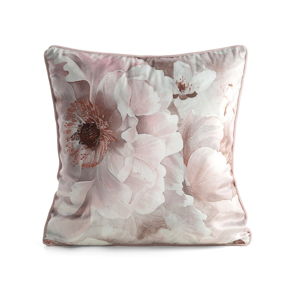 Zamatová obliečka na vankúš s kvetinovým motívom a ozdobným lemovaním. šírka: 45 cm, dĺžka: 45 cm, farba: púdrová ružová, hmotnosť: 200 GSM, zloženie: Materiál: 100% polyester