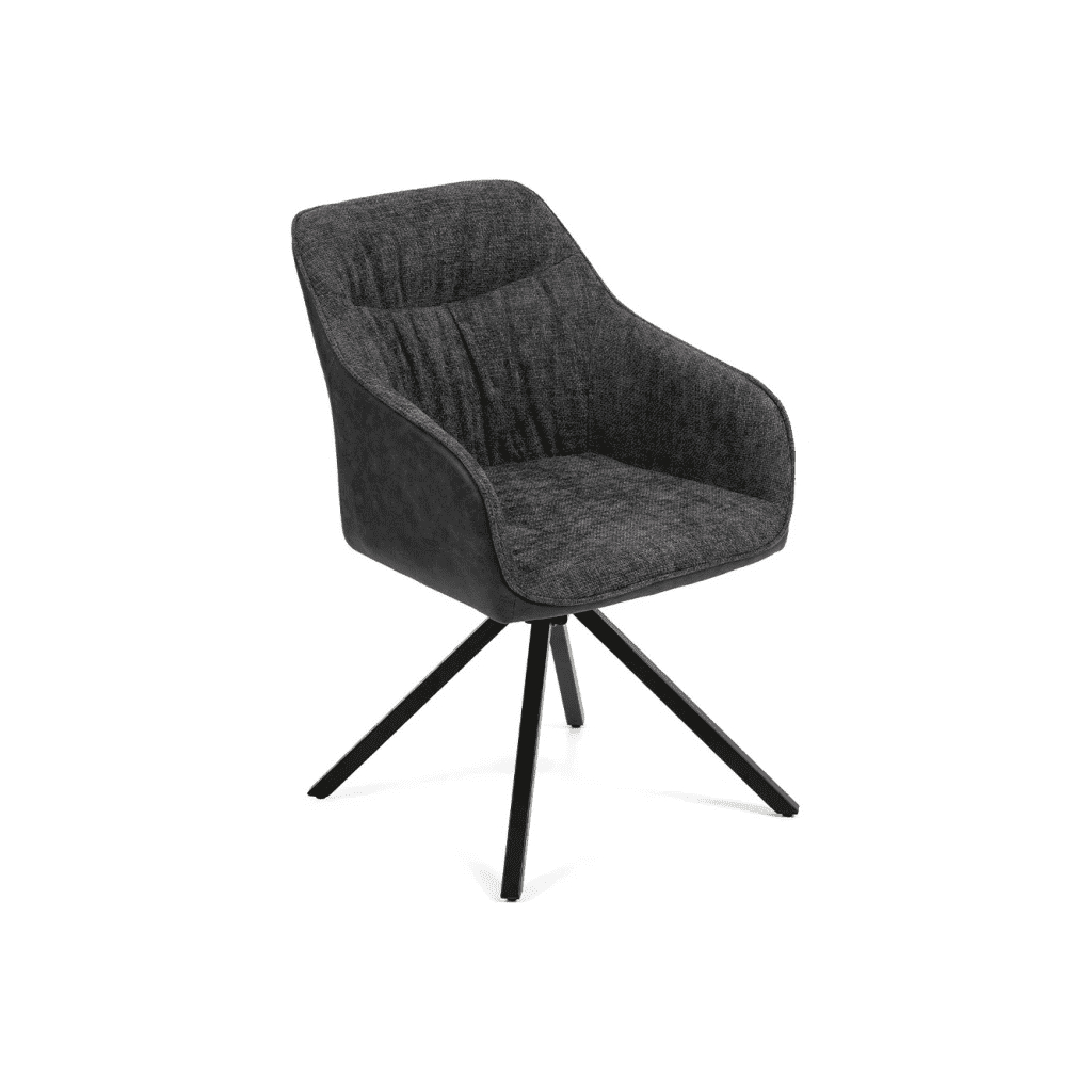 Otočná jedálenská stolička LOREN je dokonalým spojením moderného dizajnu, komfortu a praktickej funkčnosti. Elegantné čalúnenie v jemnom sivom odtieni v kombinácii s čiernou kovovou podnožou vytvára nadčasový vzhľad, ktorý sa hodí do moderných aj industriálnych interiérov. Ergonomicky tvarované operadlo s jemným vertikálnym prešívaním poskytuje výbornú oporu chrbta a spolu s integrovanými podrúčkami zabezpečuje maximálne pohodlie aj pri dlhšom sedení. Otočný mechanizmus o 180° zvyšuje komfort pri používaní a robí zo stoličky LOREN ideálnu voľbu nielen k jedálenskému stolu, ale aj do pracovne, kancelárie či zasadacej miestnosti. Stabilná kovová podnož v matnej čiernej farbe garantuje pevnosť, dlhú životnosť a bezpečné používanie. Mäkké čalúnenie je príjemné na dotyk a zároveň nenáročné na údržbu, vďaka čomu je stolička vhodná aj do domácností s deťmi či domácimi miláčikmi.