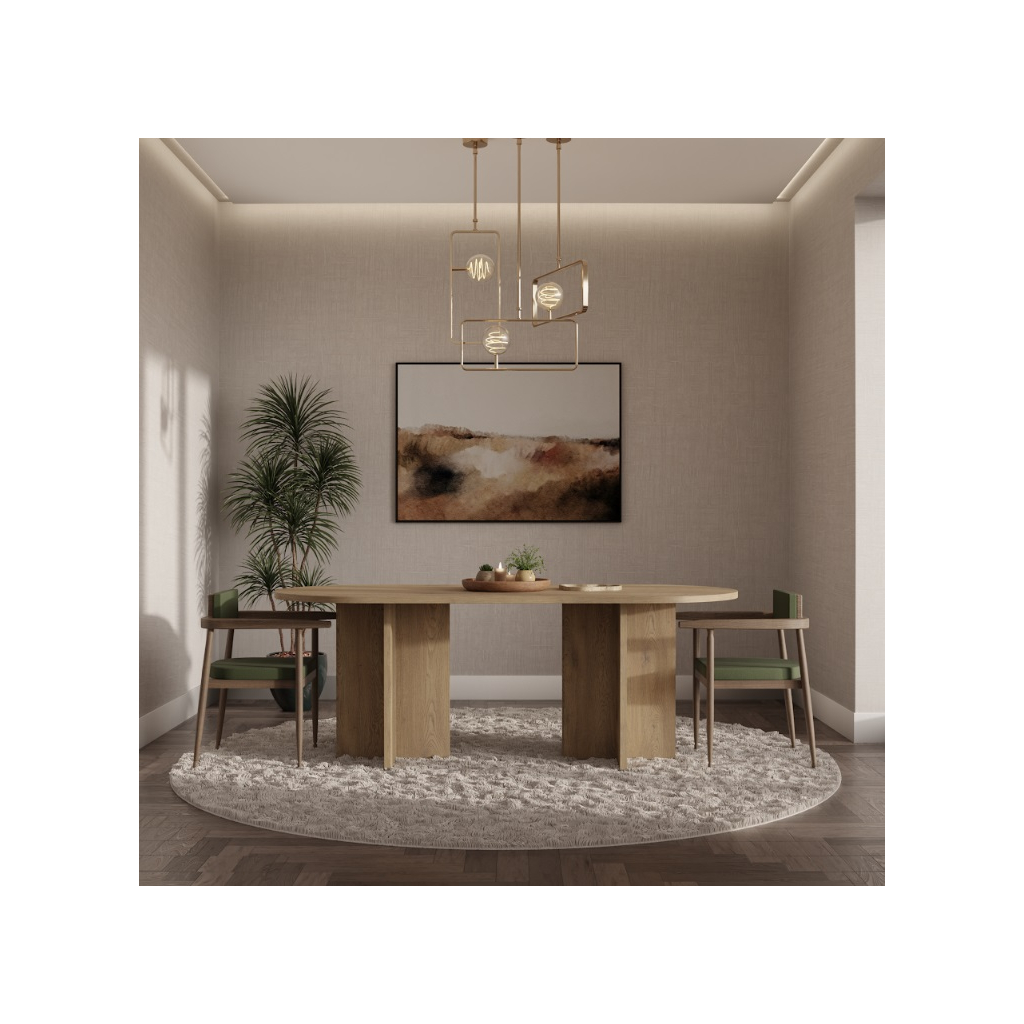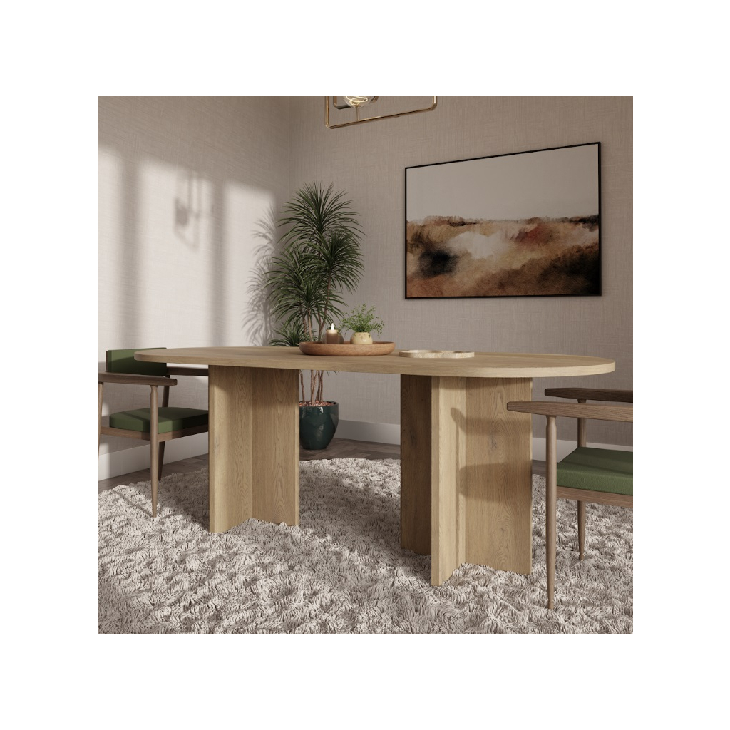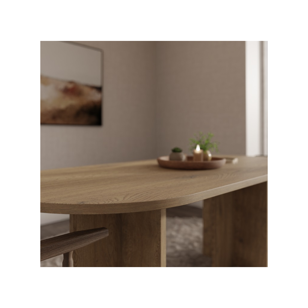 Jedálenský stôl OLEN vo farebnom prevedení dub cremona je nerozkladací s oválnym tvarom, navrhnutý v modernom, loftovom a škandinávskom štýle. Poskytuje pohodlné stolovanie pre 6 až 8 osôb a vďaka svojim rozmerom vytvára prirodzený centrálny bod domácnosti. Jedálenský stôl je ideálny do väčšej jedálne alebo obývačky s jedálenskou zónou. Je pripravený na každodenné používanie aj rodinné stretnutia. Oválny tvar stola uľahčuje komunikáciu medzi všetkými sediacimi pri stole, eliminuje ostré rohy, čo zvyšuje bezpečnosť najmä v domácnostiach s deťmi, a zároveň opticky zjemňuje priestor vo väčších miestnostiach.