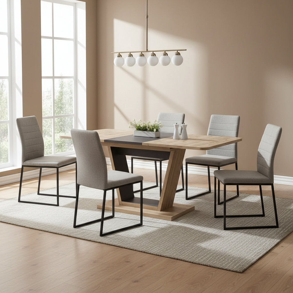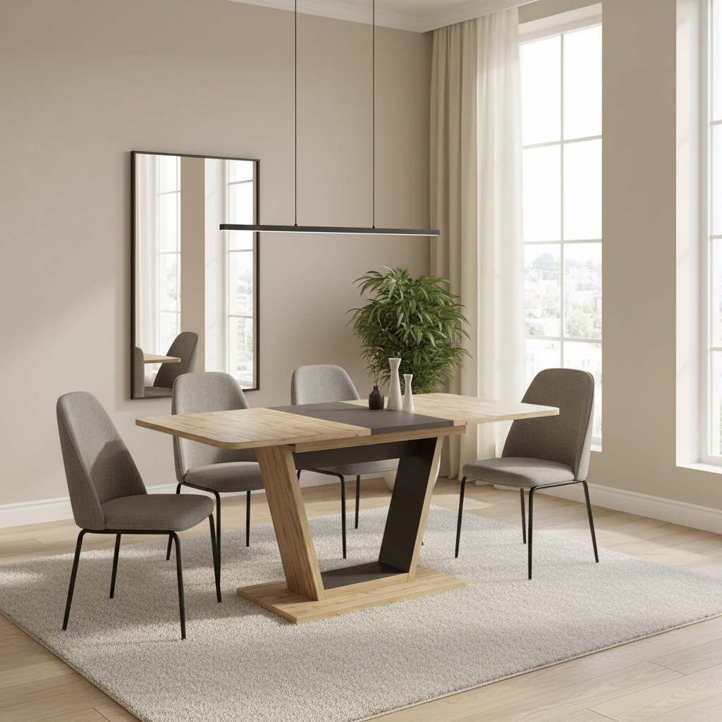 Praktický rozkladací jedálenský stôl NIGEL sa stane centrálnym bodom každej jedálne či kuchyne. Tento originálny a moderný stôl je možné rozložiť na rozmer 160 cm. Kvalitná a štýlová noha stola dodáva stabilitu a jedinečnosť. Kombinácia hnedej farby s dekorom dub wotan vytvára harmonický kontrast, ktorý osvieži každý obed alebo večeru. Jedálenský stôl je dodávaný v demonte. Stôl je vhodný pre 6 až 8 osôb.