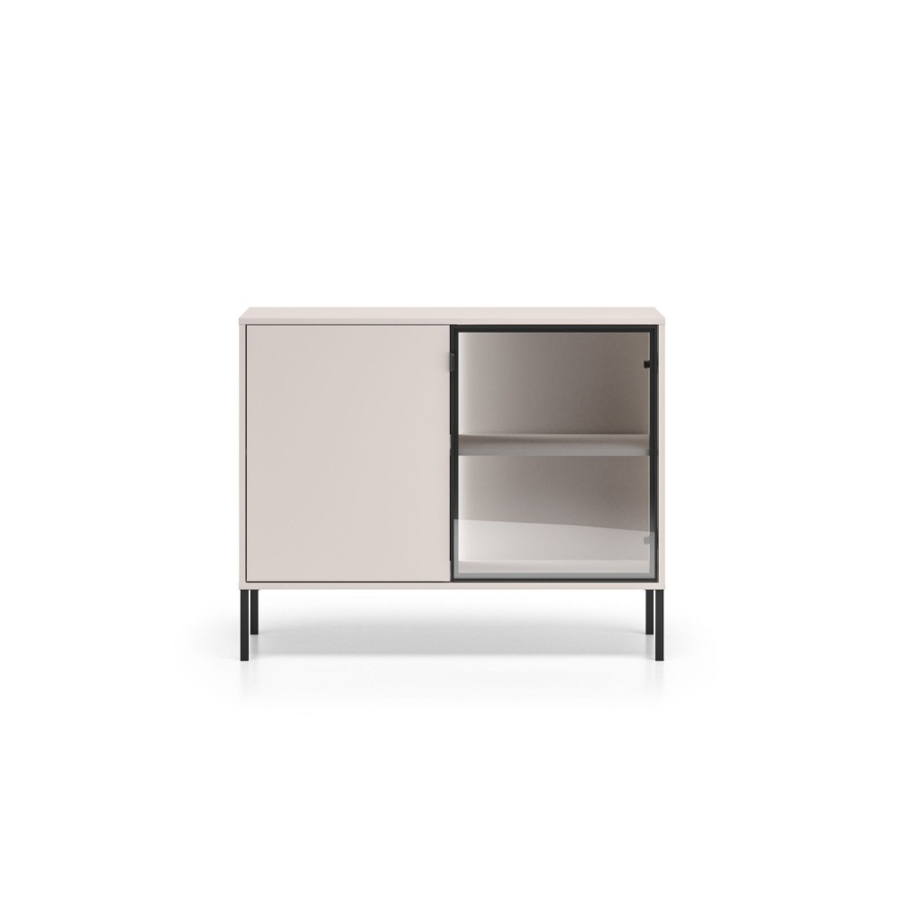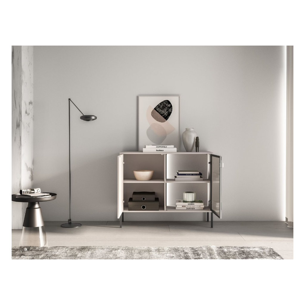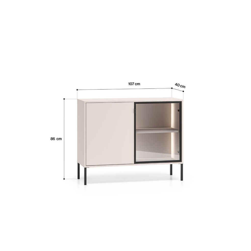 Komoda ABEREN 03 vo farebnom prevedení cashmere prináša moderný nábytok s čistými líniami, elegantnými detailmi a praktickými riešeniami. Kombinácia hliníkového rámu v čiernej farbe s tvrdeným sklom, kovových prvkov a jemného LED podsvietenia vytvára sofistikovaný vzhľad, ktorý dodá obývačke či spálni jedinečnú atmosféru. Ideálna voľba pre tých, ktorí hľadajú štýl, funkčnosť a nadčasový dizajn v jednom. Komoda je priestranná dvojdverová s vysokými nohami, ktoré sú vhodné pre robotický vysávač.