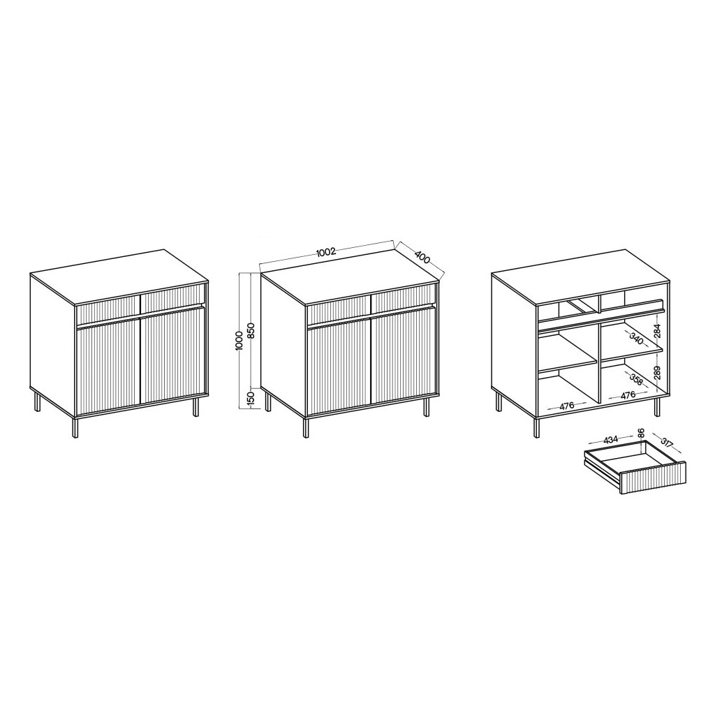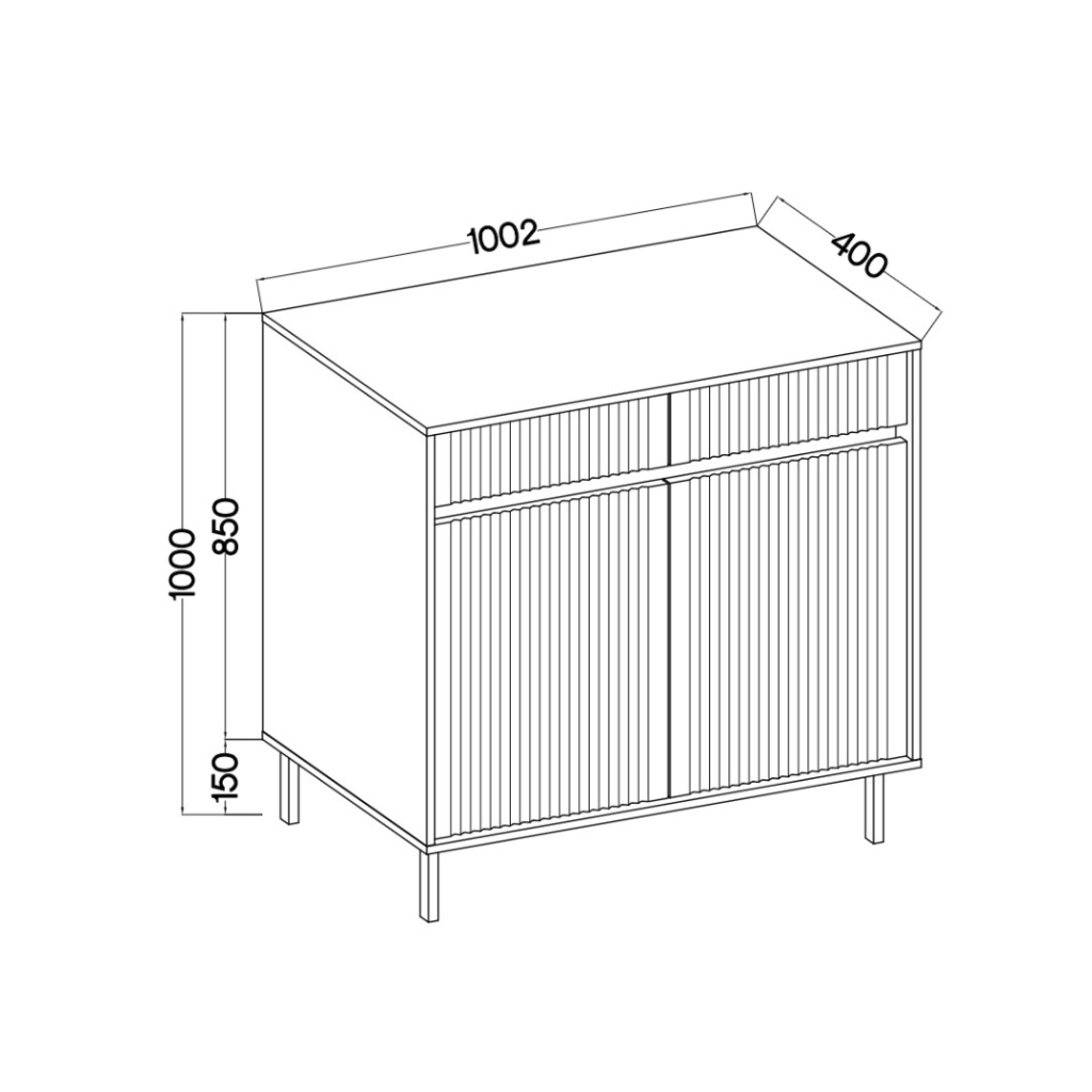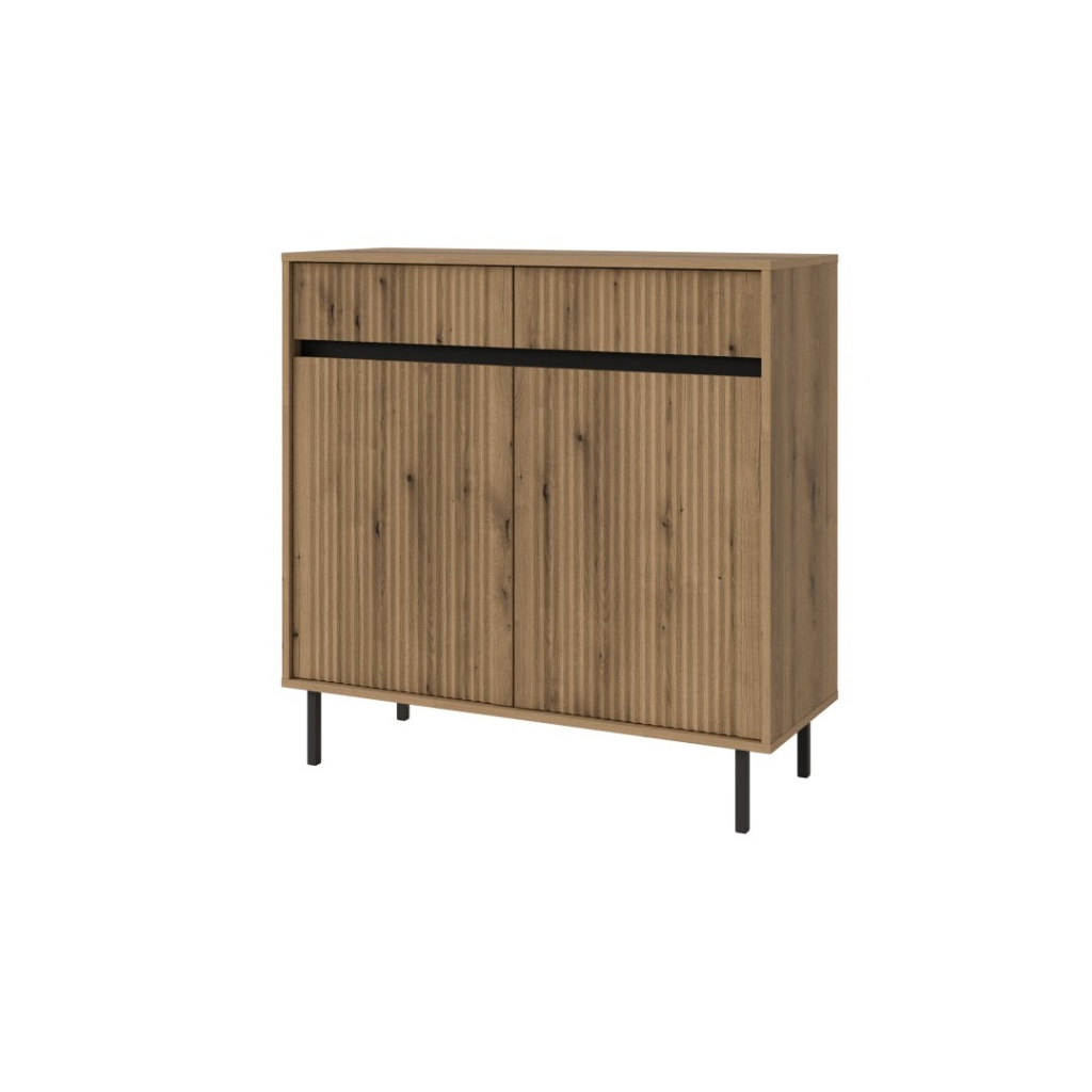 Komoda KASOA 2F2S vyniká minimalistickou formou obohatenou o precízne frézované detaily, ktoré do interiéru prinášajú úplne nový rozmer japonskej estetiky. Farebná paleta je ladená do jemných, zemitých tónov, ako je dub evoke, doplnená o čierne akcenty, ktoré elegantne kontrastujú so svetlými odtieňmi. Jednoduché čierne kovové nohy dodávajú nábytku ľahkosť a vizuálnu vzdušnosť bez toho, aby pôsobil ťažkopádne. Komoda je dvojdverová so zásuvkami a dvomi policami.