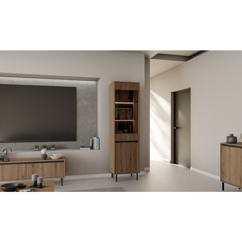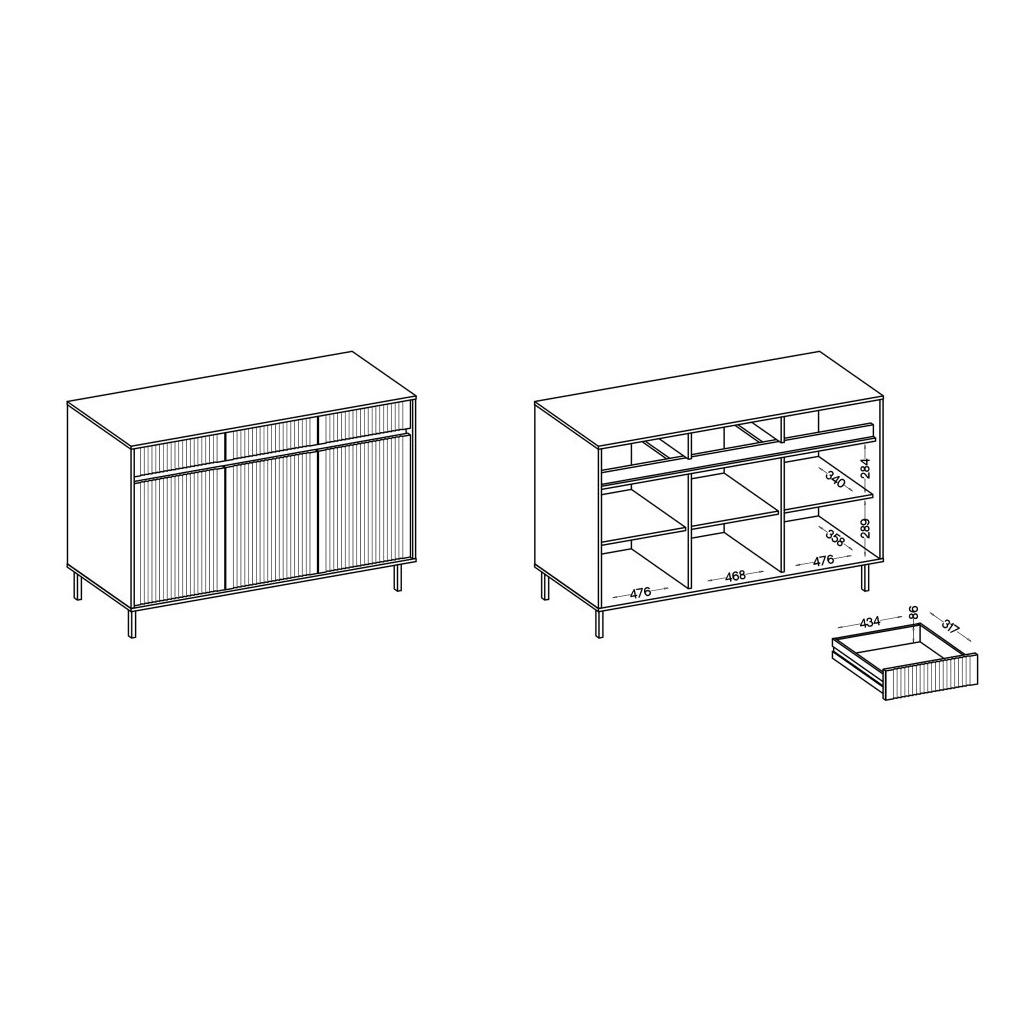 Komoda KASOA 3F3S/833 vyniká minimalistickou formou obohatenou o precízne frézované detaily, ktoré do interiéru prinášajú úplne nový rozmer japonskej estetiky. Farebná paleta je ladená do jemných, zemitých tónov, ako je dub evoke, doplnená o čierne akcenty, ktoré elegantne kontrastujú so svetlými odtieňmi. Jednoduché čierne kovové nohy dodávajú nábytku ľahkosť a vizuálnu vzdušnosť bez toho, aby pôsobil ťažkopádne. Komoda je trojdverová s tromi policami a zásuvkami.
