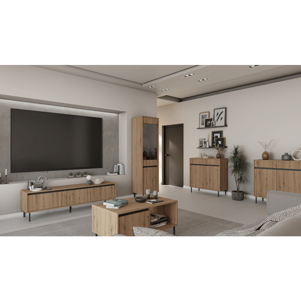 Nábytok KASOA je vyrobený z laminovanej drevotrieskovej dosky s hrúbkou 16 mm. Predné plochy sú doplnené o MDF dosky s hrúbkou 16 mm. Čierne prvky sú vyhotovené z laminovanej dosky s hrúbkou 16 mm a elegantne kontrastujú so svetlými tónmi kolekcie. Zadné steny nábytku sú vyrobené z HDF dosky s hrúbkou 2,5 mm, ktorá zabezpečuje stabilitu celej konštrukcie. Hrany sú opatrené ABS páskou, ktorá chráni nábytok pred mechanickým poškodením a zvyšuje jeho odolnosť pri každodennom používaní. Použité kovové kovanie podčiarkuje pevnosť a kvalitu spracovania.