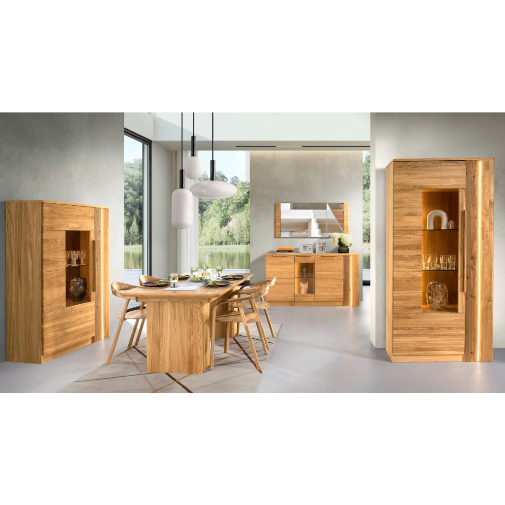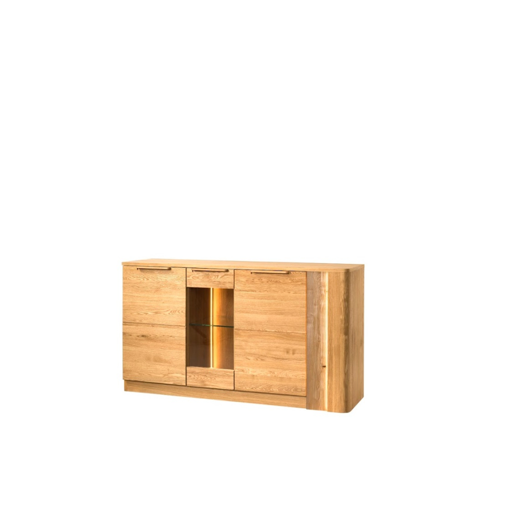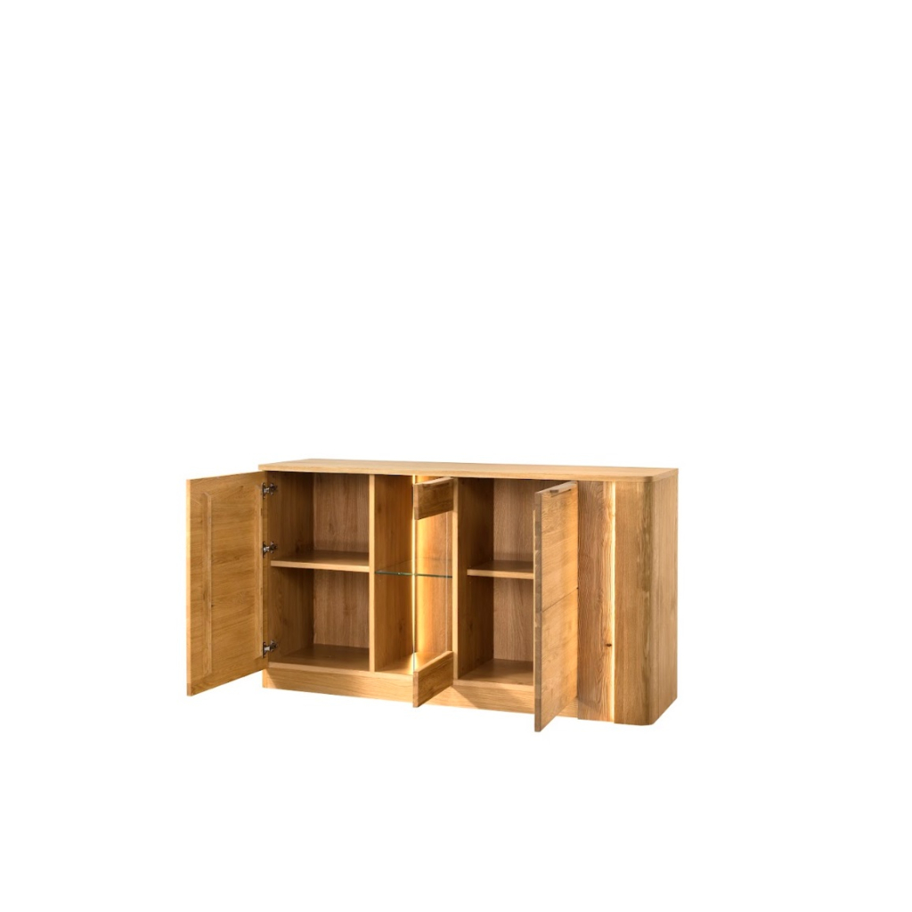 Komoda je vyrobená z kvalitných materiálov, ktoré spájajú prírodnú krásu dreva s praktickosťou moderných povrchov. Vďaka tejto kombinácii pôsobí nábytok elegantne, odolne a nadčasovo. Čelné plochy sú zhotovené z masívneho dubového dreva, ktoré vyniká prirodzenou štruktúrou a teplým odtieňom. Povrch je ošetrený prírodným olejom, ktorý zvýrazňuje kresbu dreva, chráni ho pred vlhkosťou a zachováva jeho autentický vzhľad. Korpus a vnútorné časti sú vyrobené z kvalitnej drevotriesky s odolnou melamínovou a fóliovou povrchovou úpravou. Táto kombinácia zaručuje pevnosť, stabilitu a jednoduchú údržbu, povrch je odolný voči poškriabaniu a každodennému používaniu. Dekoratívne sklenené prvky dodávajú nábytku ľahkosť a moderný vzhľad, čím elegantne dopĺňajú celkový dizajn. Spojenie masívu, drevotriesky a skla prináša dokonalú rovnováhu medzi prírodným štýlom, funkčnosťou a dlhou životnosťou.