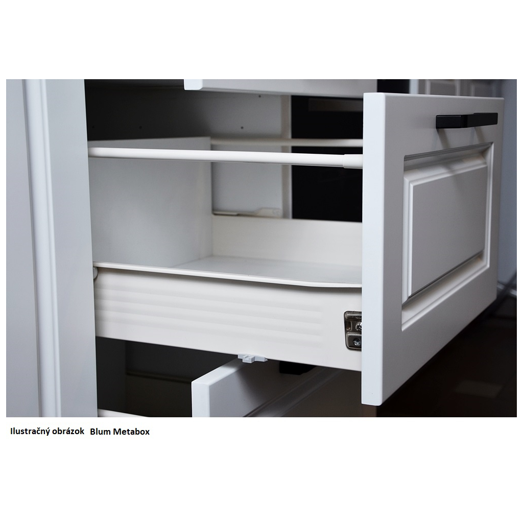 Zásuvkové skrinky majú kovové koľajnicie BLUM s kovovými bočnými lištami na zásuvkách, k tejto verzii je možnosť doobjednania systému AIRTIC (tlmené dovieranie).
