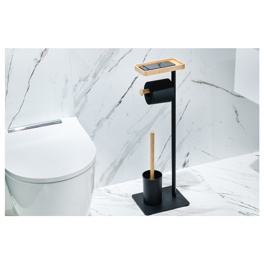 Kvalitné kúpeľňové doplnky v dizajnových prevedeniach sú čoraz obľúbenejšie. Moderný stojan na toaletný papier s kefou a držiakom na mobil splní svoj účel a vďaka modernému prevedeniu poslúži aj ako dekorácia. Čierne farebné prevedenie v kombinácii s imitáciou bambusového dreva pôsobí elegantne. V ponuke máme aj iné kúpeľňové doplnky a textil, ktoré sú dizajnovo i farebne podobné, nebude tak problém zariadiť si kúpelňu presne podľa vášho vkusu.