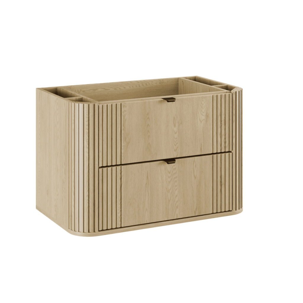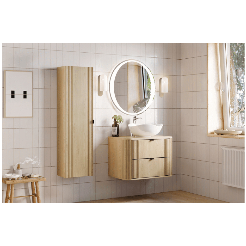 Objavte krásu nadčasového dizajnu s modernou kúpeľňovou zostavou OVALIA, ktorá kombinuje prirodzený vzhľad dreva, minimalistické línie a štýlové prvky. Svetlý dekor dreva v kombinácii s jemnými vertikálnymi frézovaniami na skrinkách pôsobí elegantne a zároveň útulne. Set obsahuje vysokú skrinku, skrinku pod umývadlo, dosku pod umývadlo a umývadlo. Samozrejmosťou je tiché dovieranie zásuviek a plný výsuv zásuviek. Komplet je vyrobený v škandinávskom štýle.