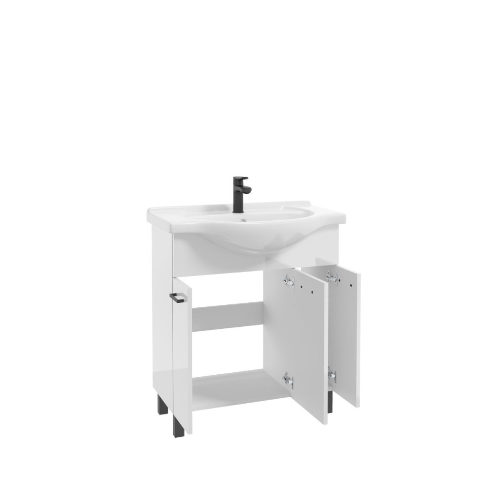 Kúpeľňová skrinka s umývadlom NOVELTY White D75 | 75 cm v modernom bielom lesku, upúta pozornosť svojou jemnou lesklou povrchovou úpravou, ktorá krásne odráža svetlo a vnáša do priestoru sviežosť a čistotu. Kúpeľňová skrinka je doplnená o čierne nohy a čierne úchytky. V cene trojdverovej skrinky je biele umývadlo Roberto. Doprajte svojej kúpeľni dotyk luxusu, ktorý si zaslúži.
