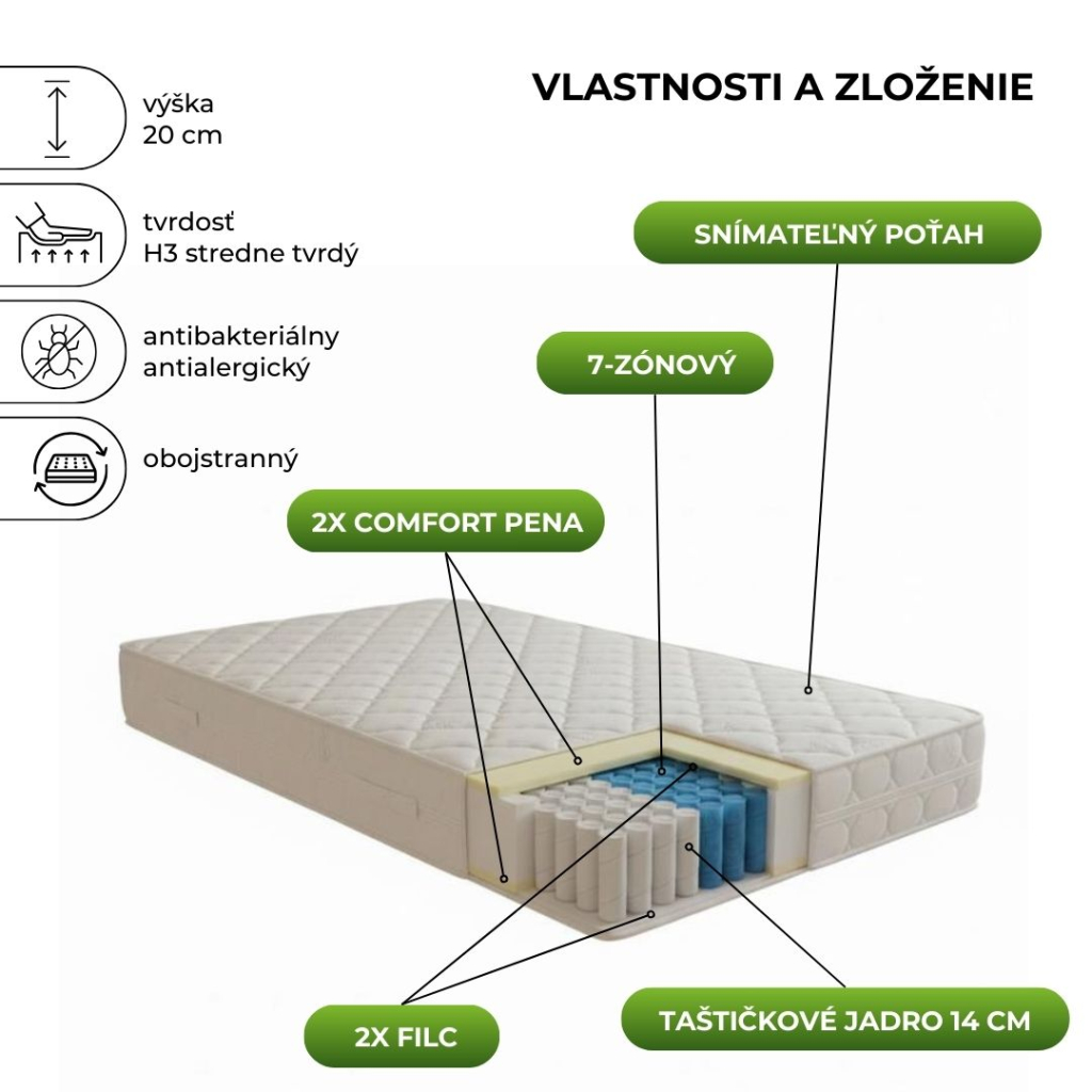 Konštrukcia matraca je navrhnutá tak, aby každá vrstva plnila svoju presnú funkciu a spolu vytvárala maximálne pohodlie. Kvalitná komfortná pena so strednou hustotou poskytuje rovnomerné rozloženie tlaku, príjemnú mäkkosť a podporu pre ramená, boky aj chrbticu. Pena je priedušná, pružná a zvyšuje celkový komfort matraca. V jadre matraca sa nachádza kvalitný 7-zónový taštičkový systém s hustotou 256 pružiniek na m². Každá pružina sa pohybuje samostatne, čo umožňuje presné kopírovanie tela a poskytuje vysokú bodovú elasticitu. Tento koncept je ideálny pre používateľov, ktorí hľadajú spojenie komfortnej mäkkosti a pevnej, stabilnej opory. Matrac s výškou 19 cm, antibakteriálnym poťahom Silver a pevne vystuženými stranami poskytuje hygienický, pohodlný a zdravý spánok. Tvrdosť H3 ho radí medzi stredne tvrdé matrace, ktoré vyhovujú širokému spektru používateľov.