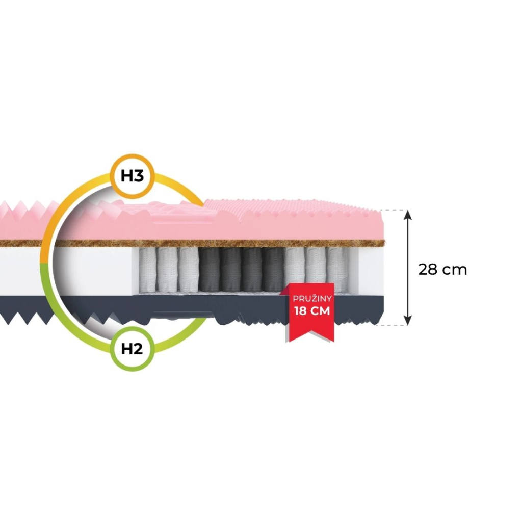 Dokonalú ventiláciu zabezpečuje profilovaná, vysoko elastická HR pena . Vyrobené z miliónov bublín, zaisťuje dokonalé prispôsobenie matraca anatomickému tvaru tela a zaručuje pohodlný spánok. Kokosová vložka zabraňuje vzniku plesní, roztočov a húb. Vďaka tomu je matrac stabilnejší. Vložka z termoplastickej peny VISCO sa vplyvom tepla a tlaku prispôsobuje tvaru tela, čo sa premieta do pohodlia počas odpočinku. Matrac má certifikát OEKO-TEX®.