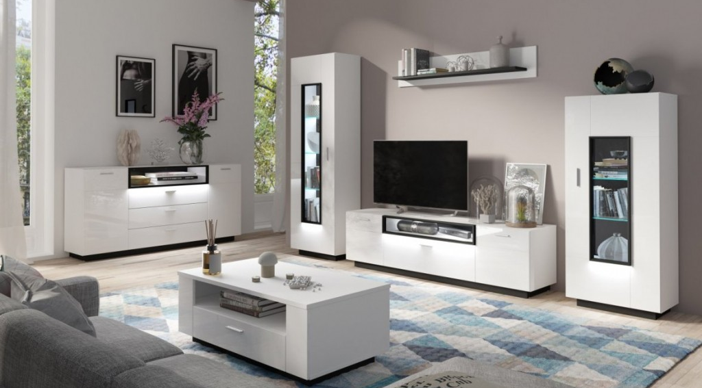 Biela lesklá farba a čierne prvky sú nesmrteľnou kombináciou, ktorá je nielen nadčasová, ale zároveň aj očarujúca. Táto kombinácia je spolu s úžasnými kovovými úchytkami, charakteristickým znakom modernej kolekcie nábytku BLAKE. Zostava je vyrobená z kvalitného materiálu, odolnému voči poškriabaniu, vlhkosti a vysokým teplotám. Nábytok ponúka možnosť výberu z viacerých dokonalých segmentov a zároveň predstavuje nadčasový dizajn a neodolateľné línie, preto by kolekcia BLAKE nemala chýbať v žiadnej modernej domácnosti.