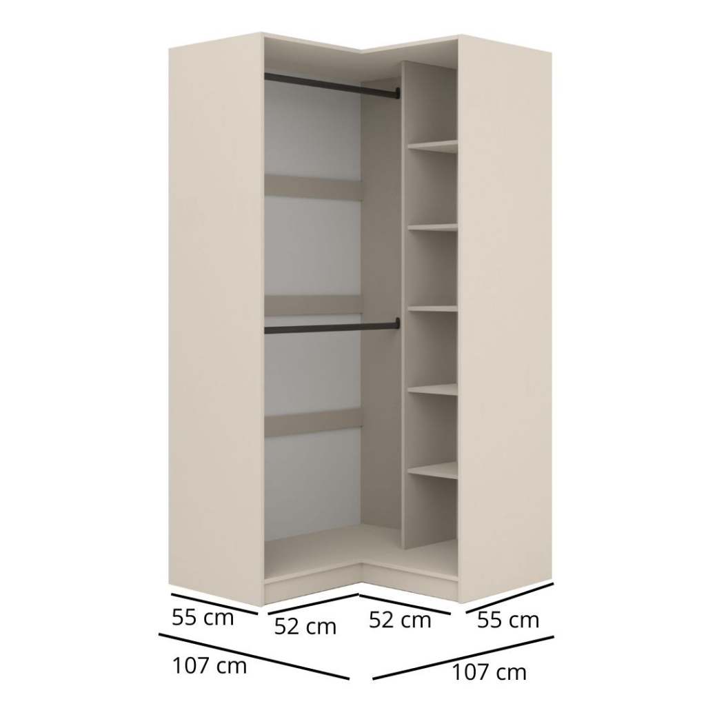 Táto rohová šatníková skriňa z kolekcie FOX je praktickým riešením na efektívne využitie rohového priestoru v miestnosti. Vďaka jednoduchému dizajnu v elegantnom odtieni cashmere pôsobí čisto a nadčasovo. Skriňa je vyrobená z 16 mm laminovanej nábytkovej dosky, ktorá zabezpečuje stabilitu a dlhú životnosť. Je ideálnym doplnkom modulovej zostavy, vďaka ktorému si môžete vyskladať funkčný a ucelený šatník podľa dispozície interiéru. V prípade záujmu je možné doobjednať aj nadstavec na rohovú skriňu FOX.