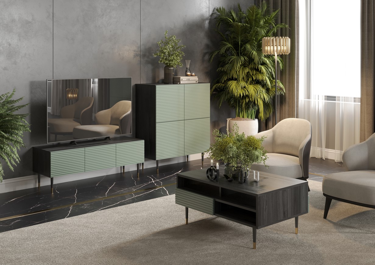 Luxusný a štýlový nábytok IMPERIAL , ktorý má elegantné rebrované predné diely v pistáciovej zelenej farbe. Pistáciová zelená farba pridáva nábytku sviežosť a originalitu, čo ju robí jedinečnou a nezameniteľnou. Vyššie kovové nohy v čierno-zlatej kombinácií sú nielen štýlové, ale zároveň uľahčujú údržbu podlahy.