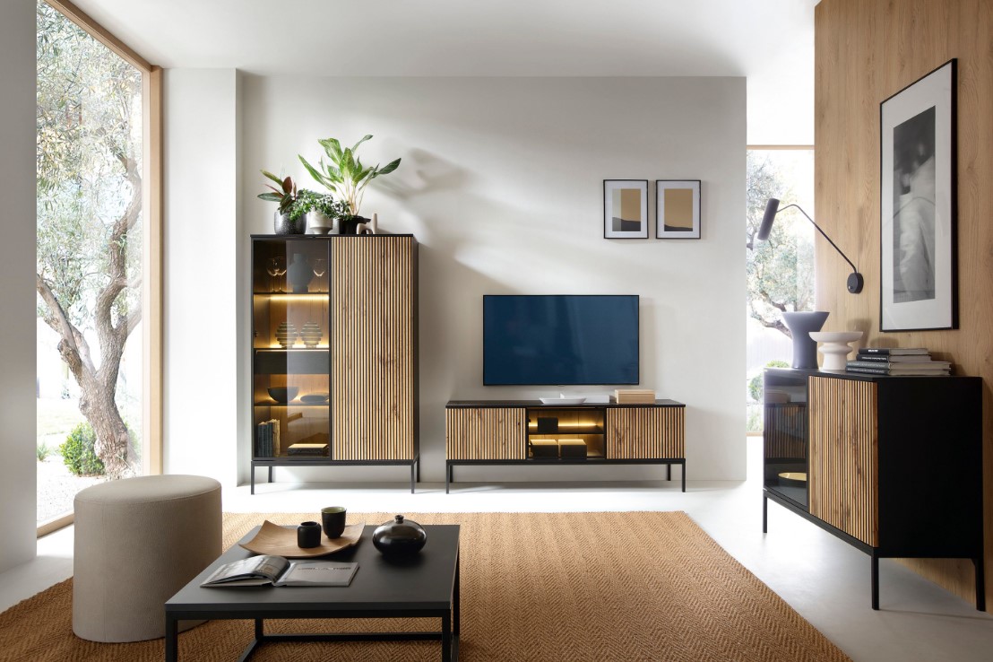 Ak hľadáte kvalitnú, modernú a funkčnú zostavu do obývačky, INTENSO je ideálnou voľbou. Táto moderná zostava je navrhnutá na vysokých nohách, čo dodáva vášmu interiéru elegantný a vzdušný vzhľad. Vyrobená je z pevnej a odolnej konštrukcie, dvierka oživujú lamely. Navyše, táto úžasná zostava je vybavená LED osvetlením, ktoré navodí príjemnú atmosféru, čím podčiarkuje jej jedinečný vzhľad.