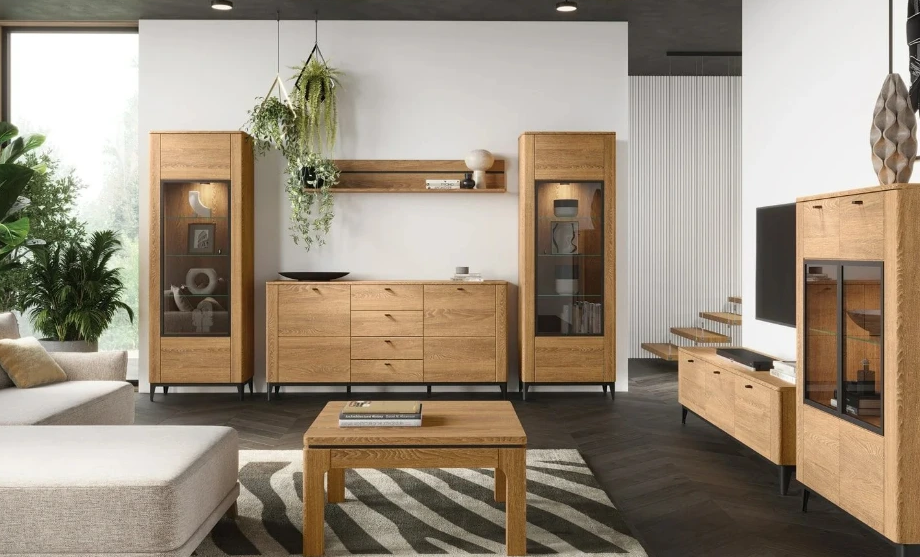 Moderná kolekcia nábytku PORTO, je vyrobená v neodolateľnom hnedom prevedení dubu, kde sú jedinečné výrezy dreva viditeľné a vďaka tomu ponúka nábytok vzhľad krásneho prirodzeného dreva. Charakteristické pre zostavu sú použité tmavé tvrdené sklá, čierne kovové úchytky, nohy a jemný sokel, ktoré dodávajú kolekcii šarm a eleganciu. Kolekcia neponúka len dokonalý vzhľad, ale aj funkčnosť. Priestranné komody a presklené vitríny umožňujú vďaka dostatku úložného miesta vyložiť obľúbené doplnky. Tak už viac nehľadajte a doprajte si eleganciu a jedinečnosť vo Vašej domácnosti, vďaka modernej zostave nábytku PORTO.