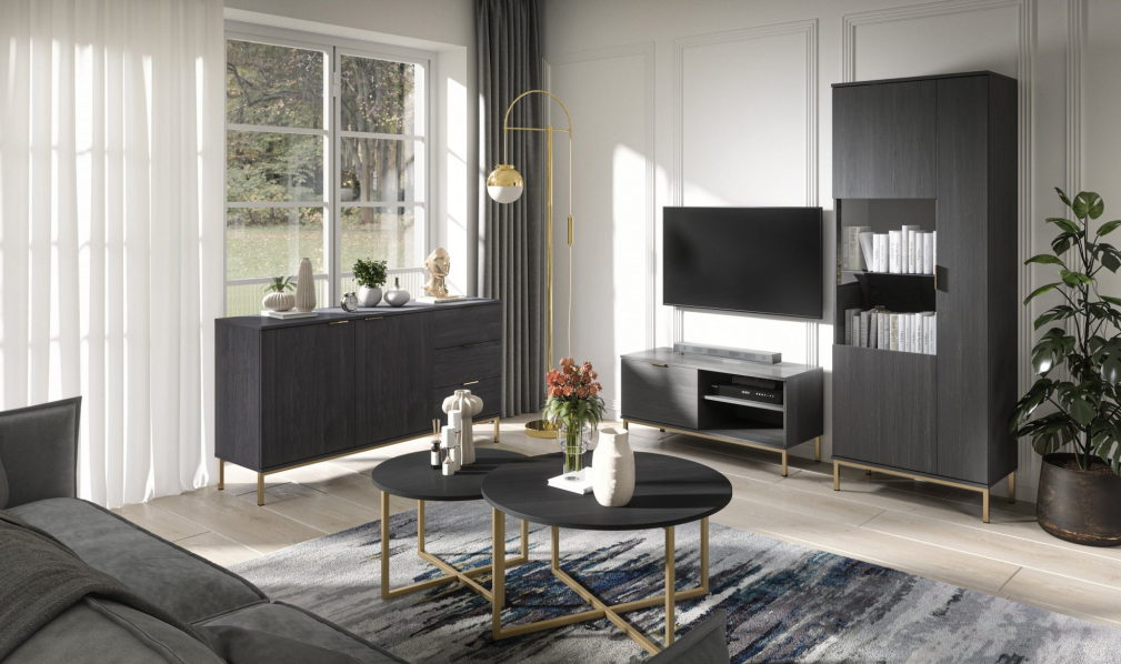 Originálna zostava nábytku PULA v dekore jaseň portland čierny, ktorá je oživená zlatými nohami, sa stane neodmysliteľnou súčasťou vašej obývačky. Jednoduché línie sú oživené jemnými úchytkami a vysoké nohy celú kolekciu odľahčujú, veľkým plusom je množstvo úložného priestoru. Popustite uzdu svojej fantázii pri zariaďovaní obývačky a oživte si interiér s kolekciou PULA.
