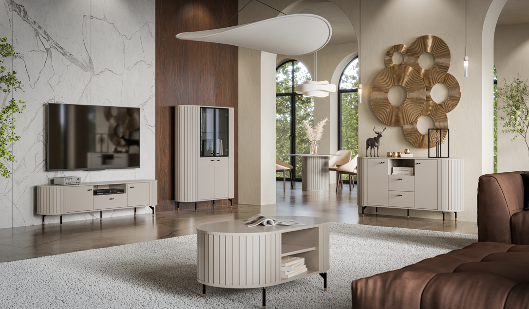 Vytvorte si štýlovú a útulnú obývačku s moderným nábytkom TENZA, ktorý kombinuje elegantný dizajn so špičkovou kvalitou. Zaoblené hrany nábytku pridávajú jemnosť a bezpečnosť, čo ocenia rodiny s deťmi, a zároveň vytvárajú plynulé línie, ktoré harmonizujú s každým interiérom. Vertikálne drážkovanie na dvierkach a zásuvkách nielen že esteticky zvýrazňuje moderný vzhľad nábytku, ale dodáva mu aj zaujímavú textúru, ktorá pútavo dopĺňa každý priestor. Na výber máte z elegantnej čiernej alebo obľúbenej kašmírovej farby.