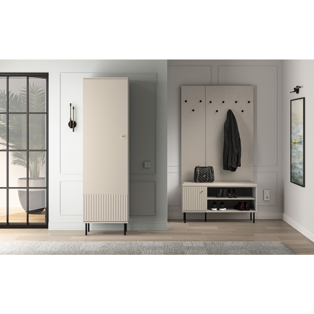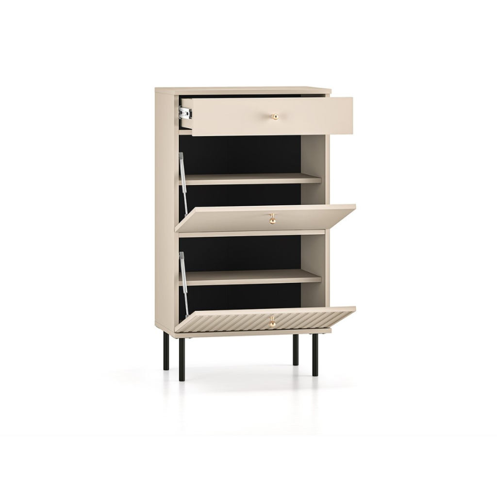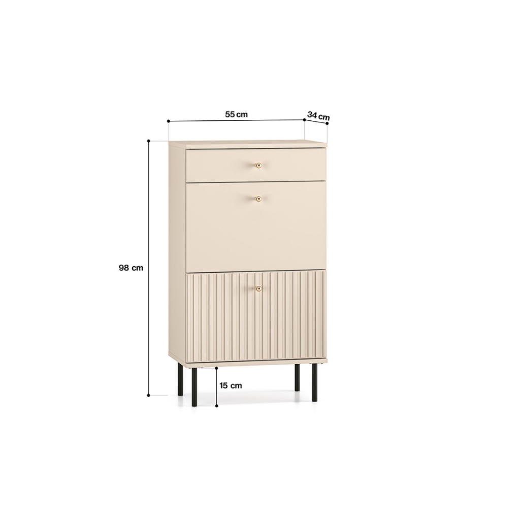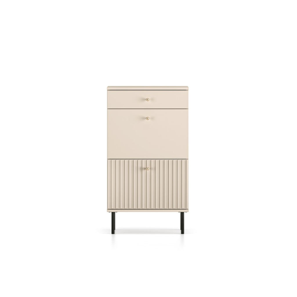 Priestranný botník OLIVIA 13 má praktické vysoké nohy v čiernej farbe. Botník je v trendy farbe kašmír, zdobený vrúbkami na spodnej časti dvierok. Zvislé vrúbky zdôrazňujú eleganciu a charakter botníka, dodávajú priestoru textúru a hmatateľnosť, čím vytvárajú zaujímavý vizuálny kontrast s hladkými povrchmi. Botník má výklopné dvierka a jednu zásuvku. Doprajte si útulný priestor, kde sa budete cítiť pohodlne a doma.