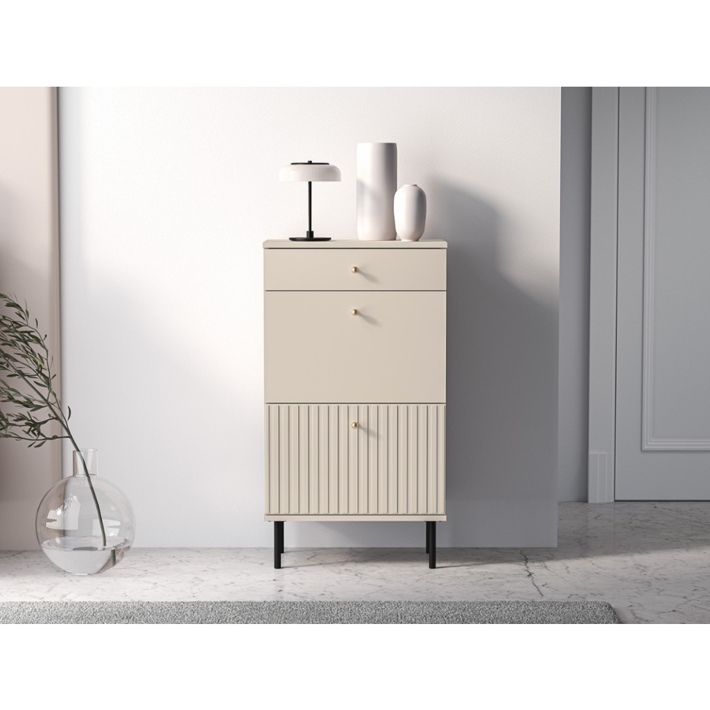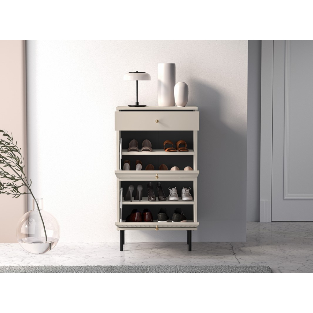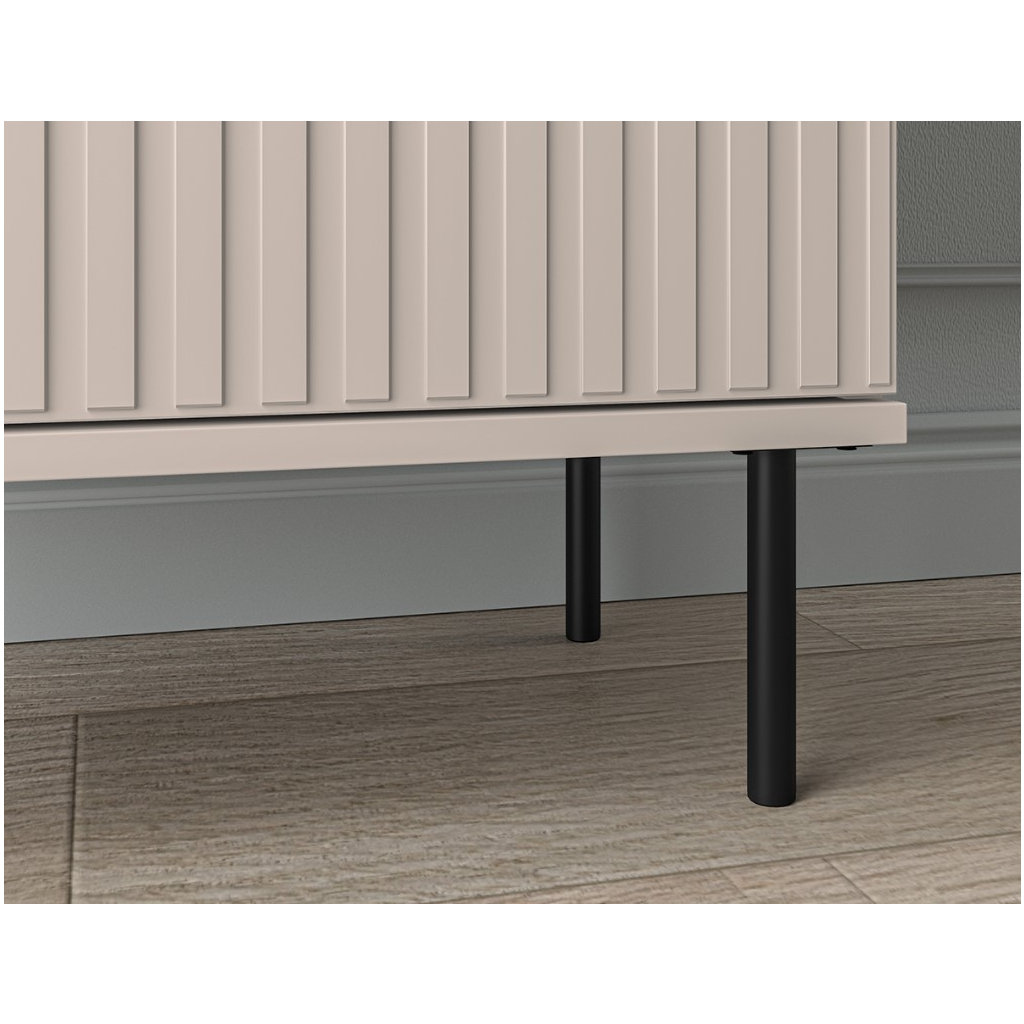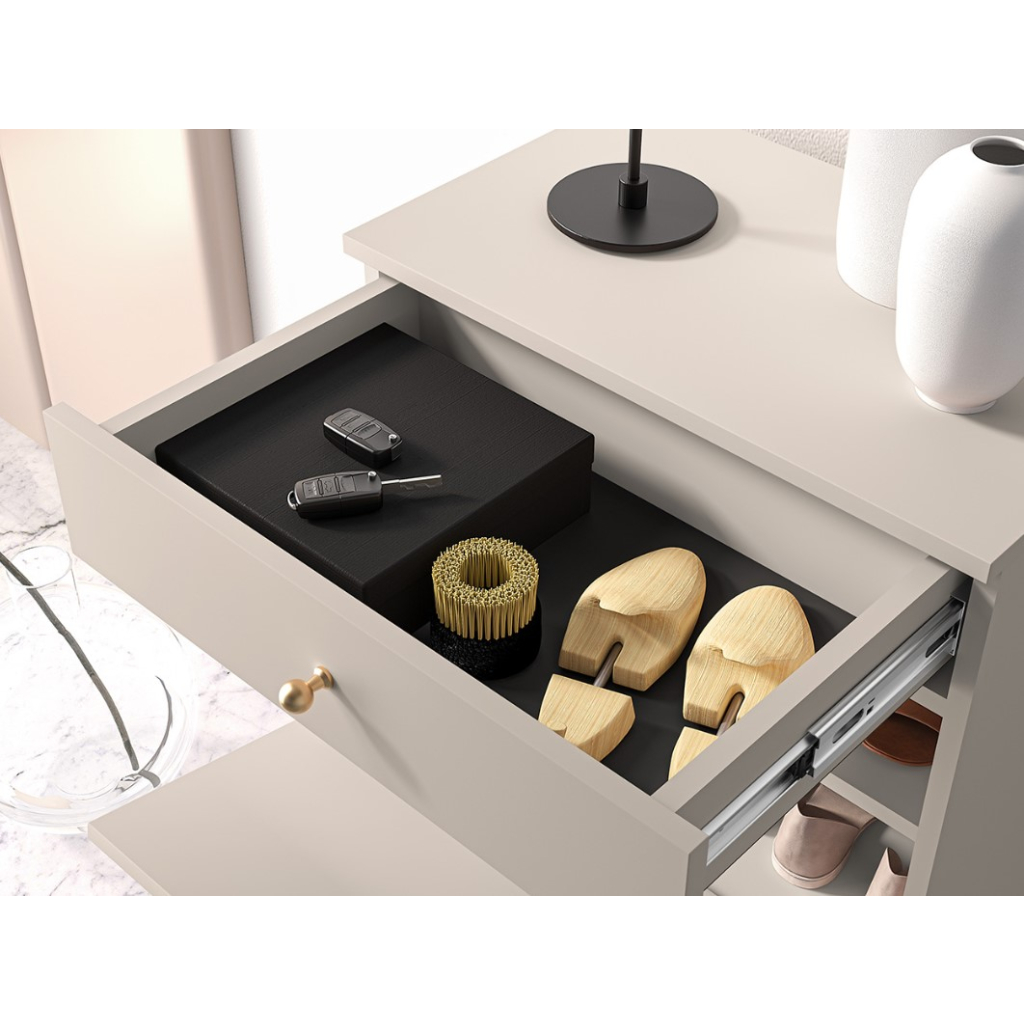 Priestranný botník OLIVIA 13 má praktické vysoké nohy v čiernej farbe. Botník je v trendy farbe kašmír, zdobený vrúbkami na spodnej časti dvierok. Zvislé vrúbky zdôrazňujú eleganciu a charakter botníka, dodávajú priestoru textúru a hmatateľnosť, čím vytvárajú zaujímavý vizuálny kontrast s hladkými povrchmi. Botník má výklopné dvierka a jednu zásuvku. Doprajte si útulný priestor, kde sa budete cítiť pohodlne a doma.