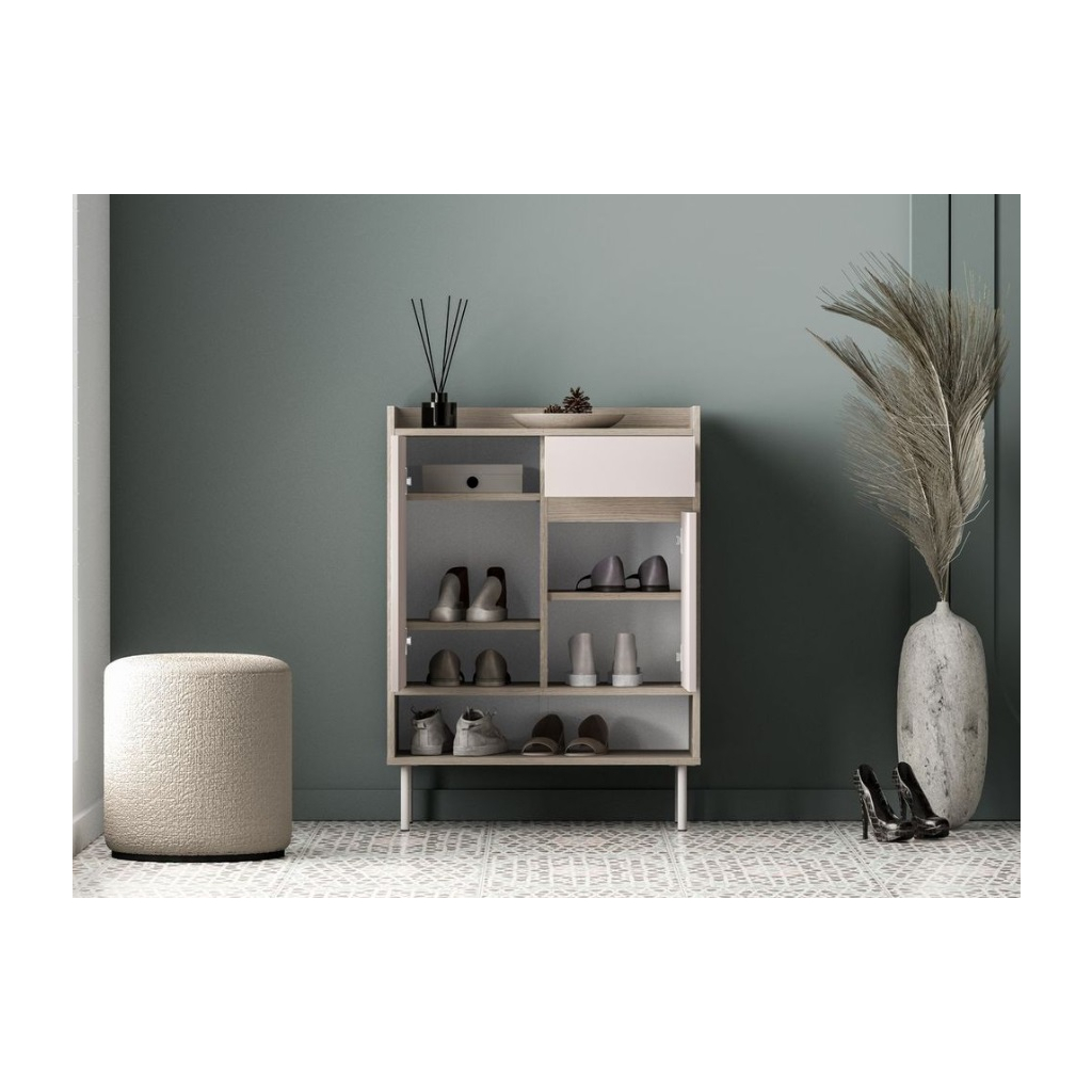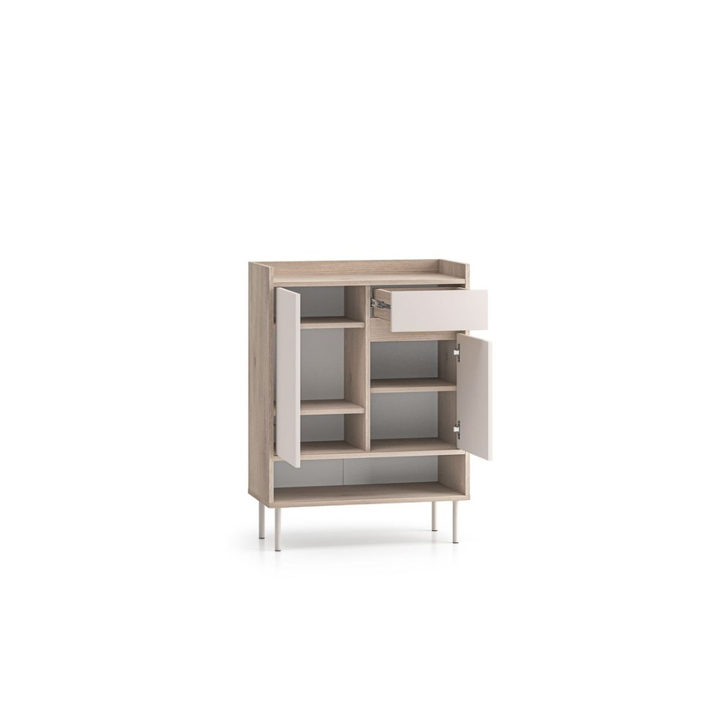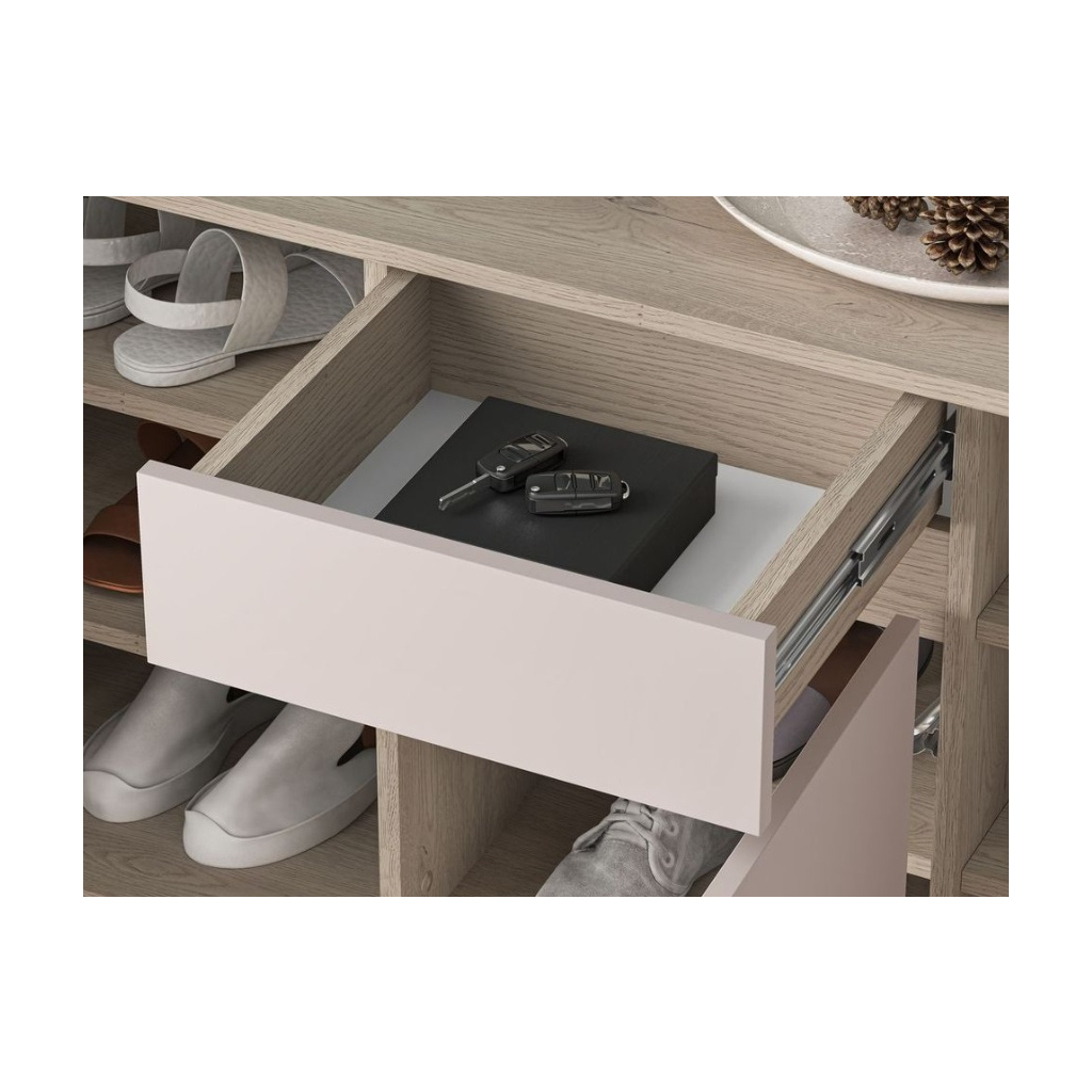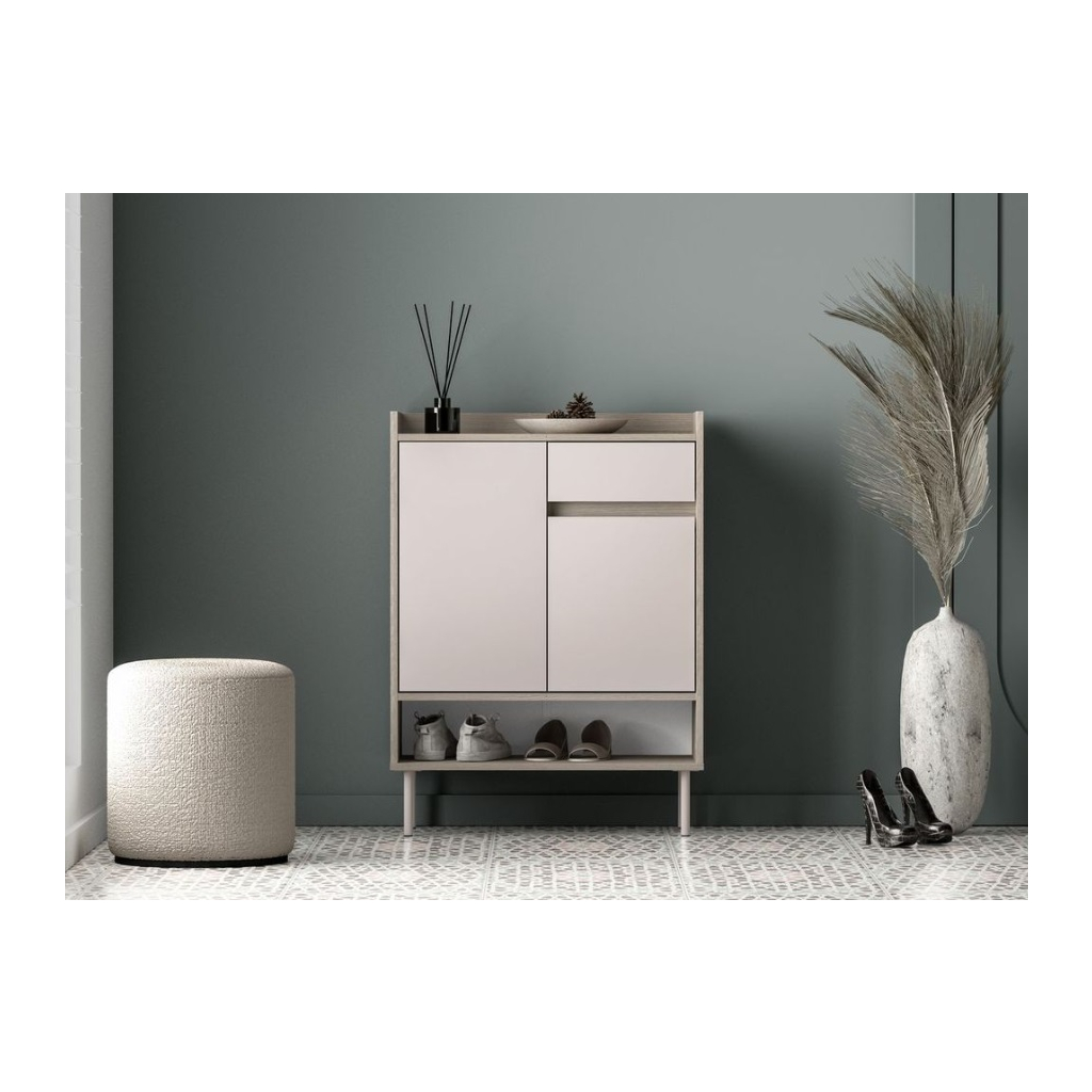 Botník VOIR 03 má farebné kombináciu jemného kašmíru a elegantného duba Cremona Terracotta, ktorý vytvára ideálne spojenie, ktoré sa hodí do moderných interiérov. Bezúchytkové čelá dodávajú jednotlivým prvkom minimalistický charakter a jednoduché kovové nožičky podčiarkujú ich ľahkosť a zároveň uľahčujú efektívne upratovanie. Vysoká funkčnosť nábytku zabezpečuje pohodlné používanie každý deň. Botník je priestranný dvojdverový so zásuvkou.