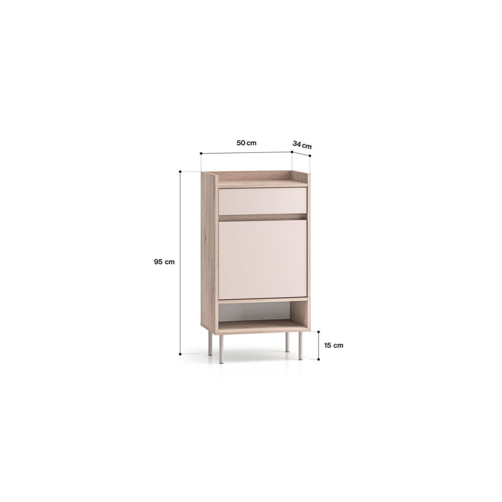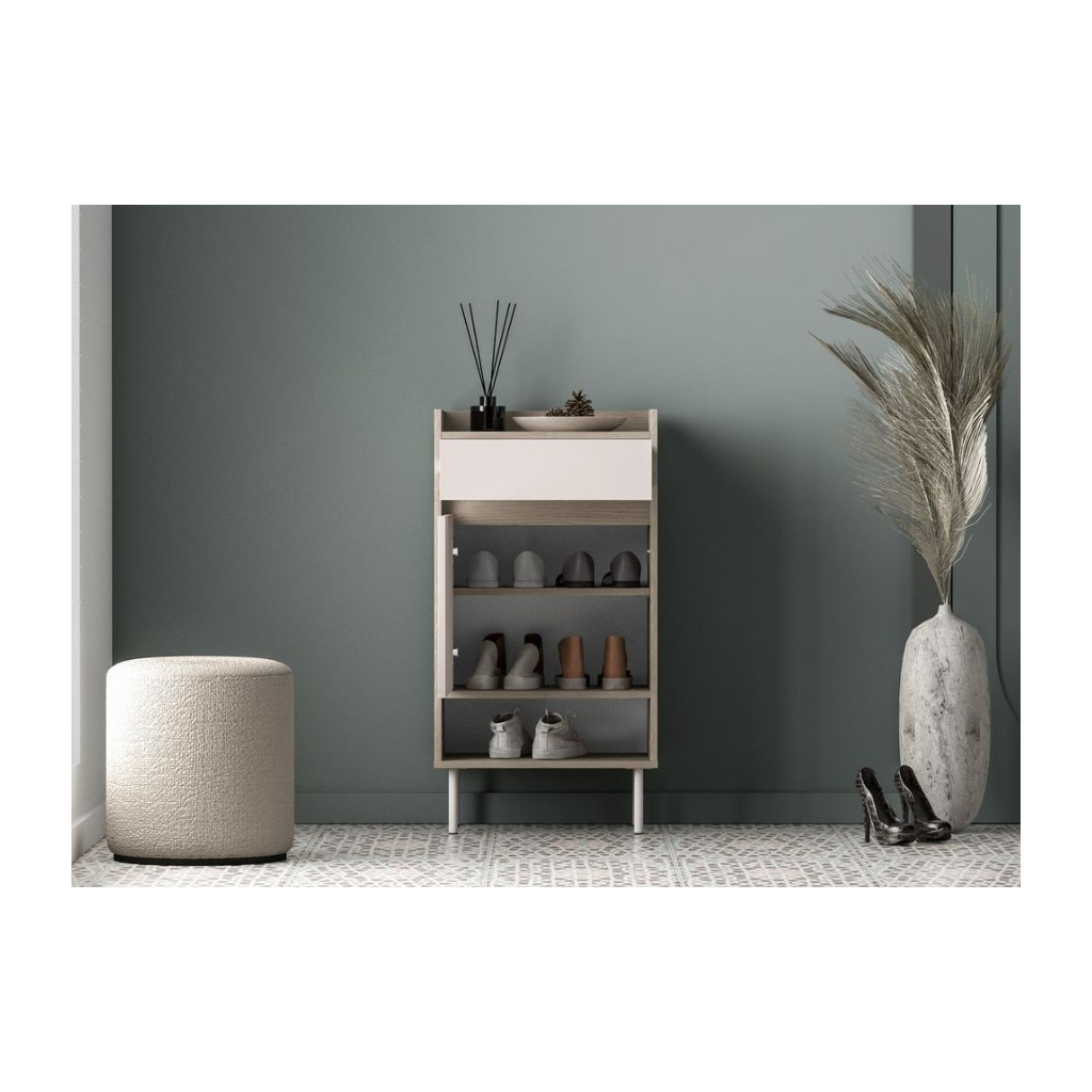 Botník VOIR 04 má farebné kombináciu jemného kašmíru a elegantného duba Cremona Terracotta, ktorý vytvára ideálne spojenie, ktoré sa hodí do moderných interiérov. Bezúchytkové čelá dodávajú jednotlivým prvkom minimalistický charakter a jednoduché kovové nožičky podčiarkujú ich ľahkosť a zároveň uľahčujú efektívne upratovanie. Vysoká funkčnosť nábytku zabezpečuje pohodlné používanie každý deň. Botník má jednu policu, dvierka a otvorenú policu.