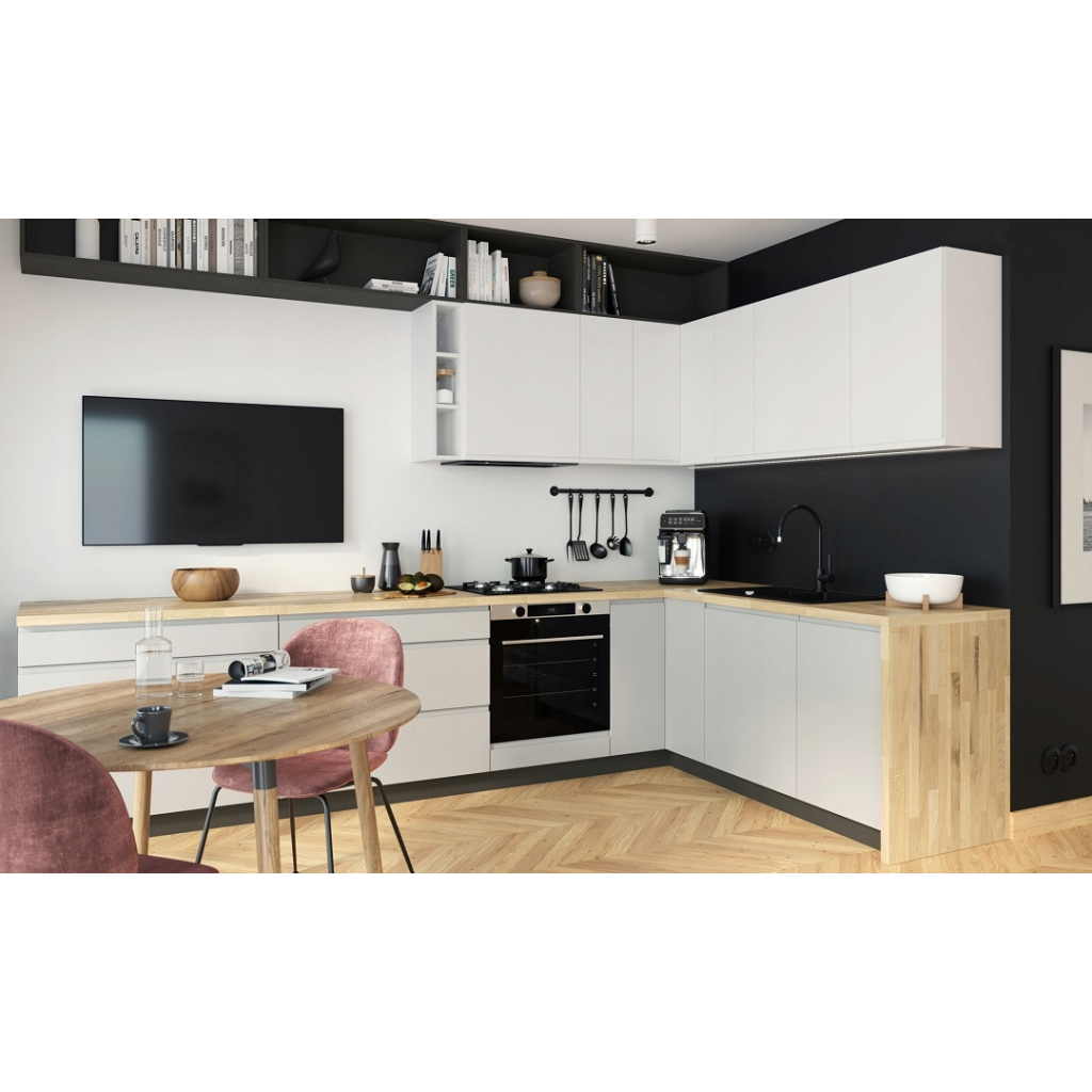 Korpus je vyrobený z laminátu hrúbky 18 mm s ABS hranami 0,5 mm. Dvierka (19 mm) sú vyrobené z kvalitného laminátu, ktorý je z vnútornej strany potiahnutý bielym laminátom a z vonkajšej strany je akryl s matnou povrchovou úpravou a hranami ABS. Akrylové dvierka sú veľmi pevné a odolné voči poškriabaniu, vynikajú ultramatným povrchom a úpravou proti odtlačkom prstov.