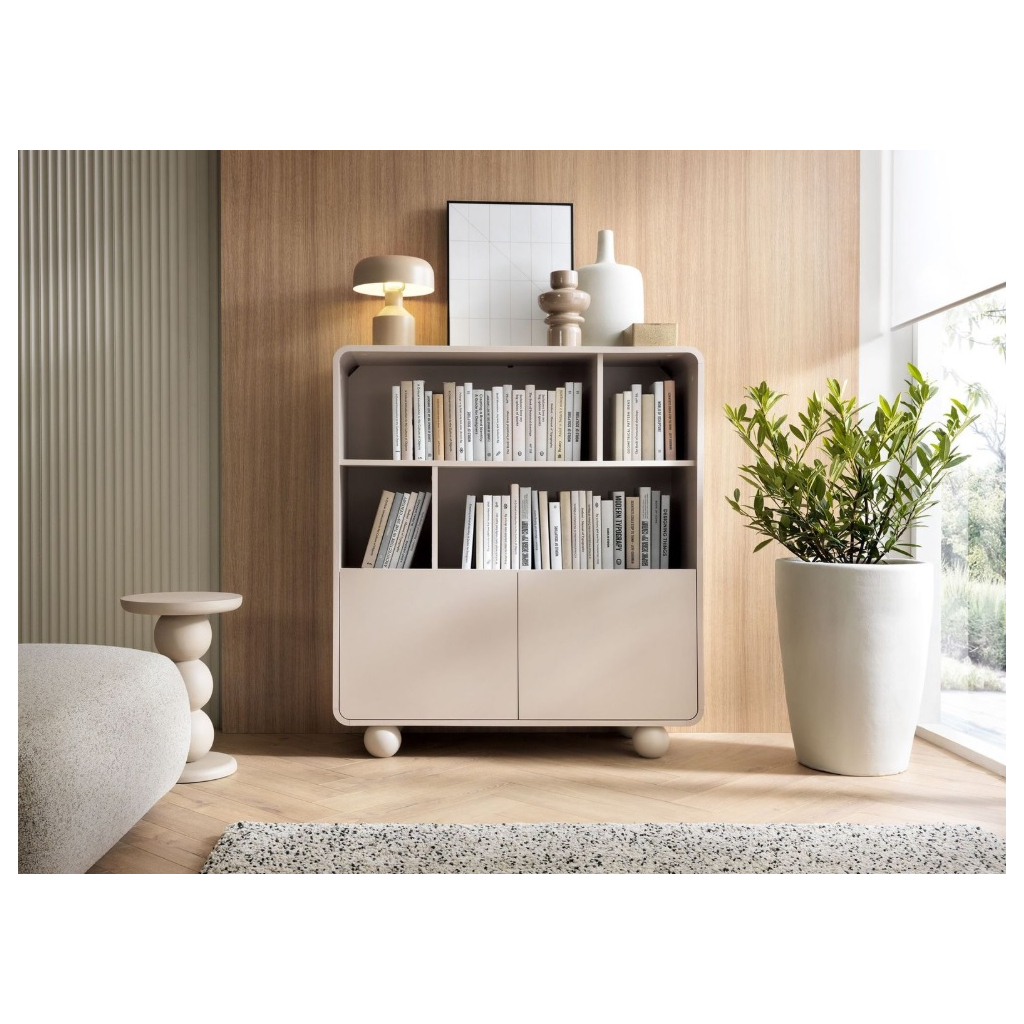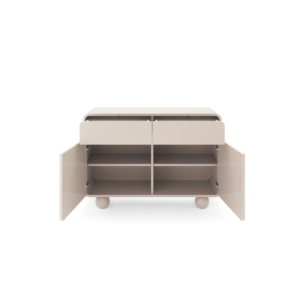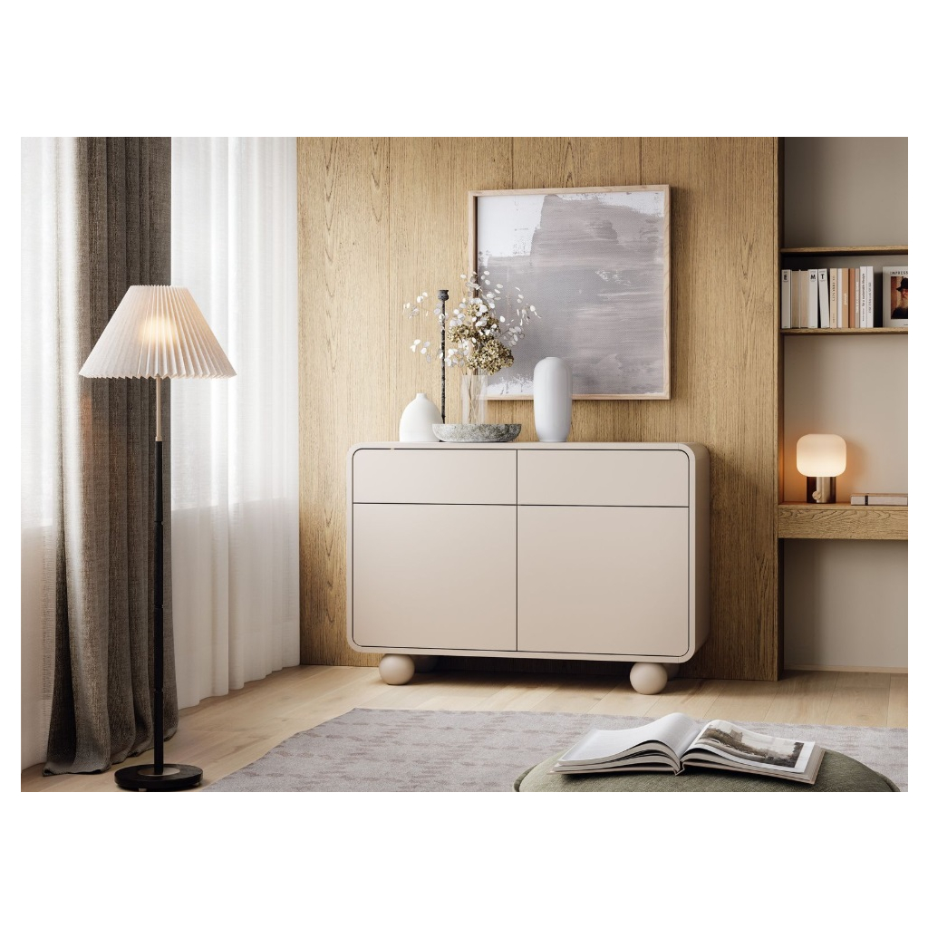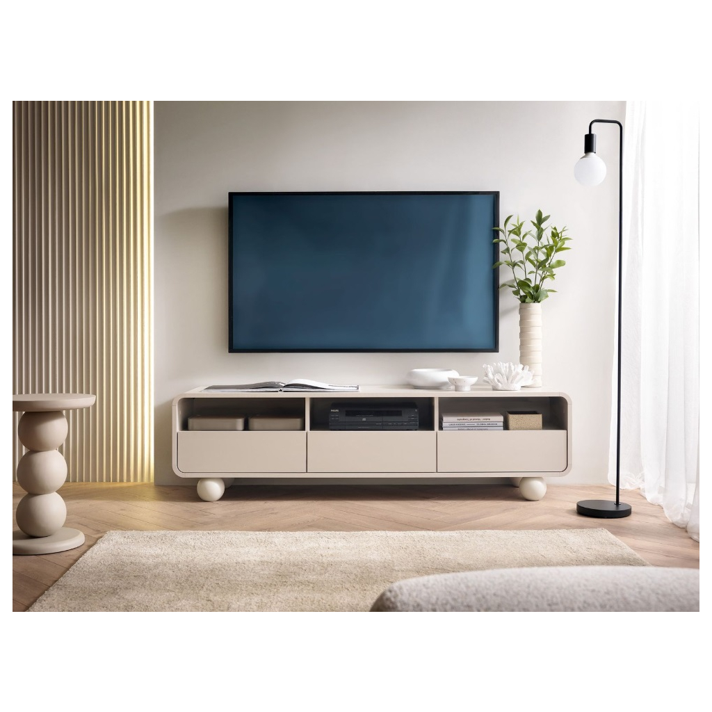 Obývacia stena NIBAL zaujme svojimi jemne zaoblenými tvarmi, ktoré pôsobia elegantne a nadčasovo. Precízne zakrivené hrany na obývacej stene dodávajú nábytku harmonický vzhľad a zároveň zvyšujú bezpečnosť pri každodennom používaní. Typickým dizajnovým prvkom sú guľaté nožičky. Povrch v odtieni jemného kašmíru pôsobí príjemne a moderne, vďaka čomu nábytok skvelo zapadne do rôznych interiérových štýlov. Hladké plochy bez úchytiek podporujú jednoduchosť a nenarušenú líniu, zatiaľ čo systém push-to-open umožňuje otváranie zásuviek a dvierok jemným zatlačením, bez potreby klasických úchytiek.