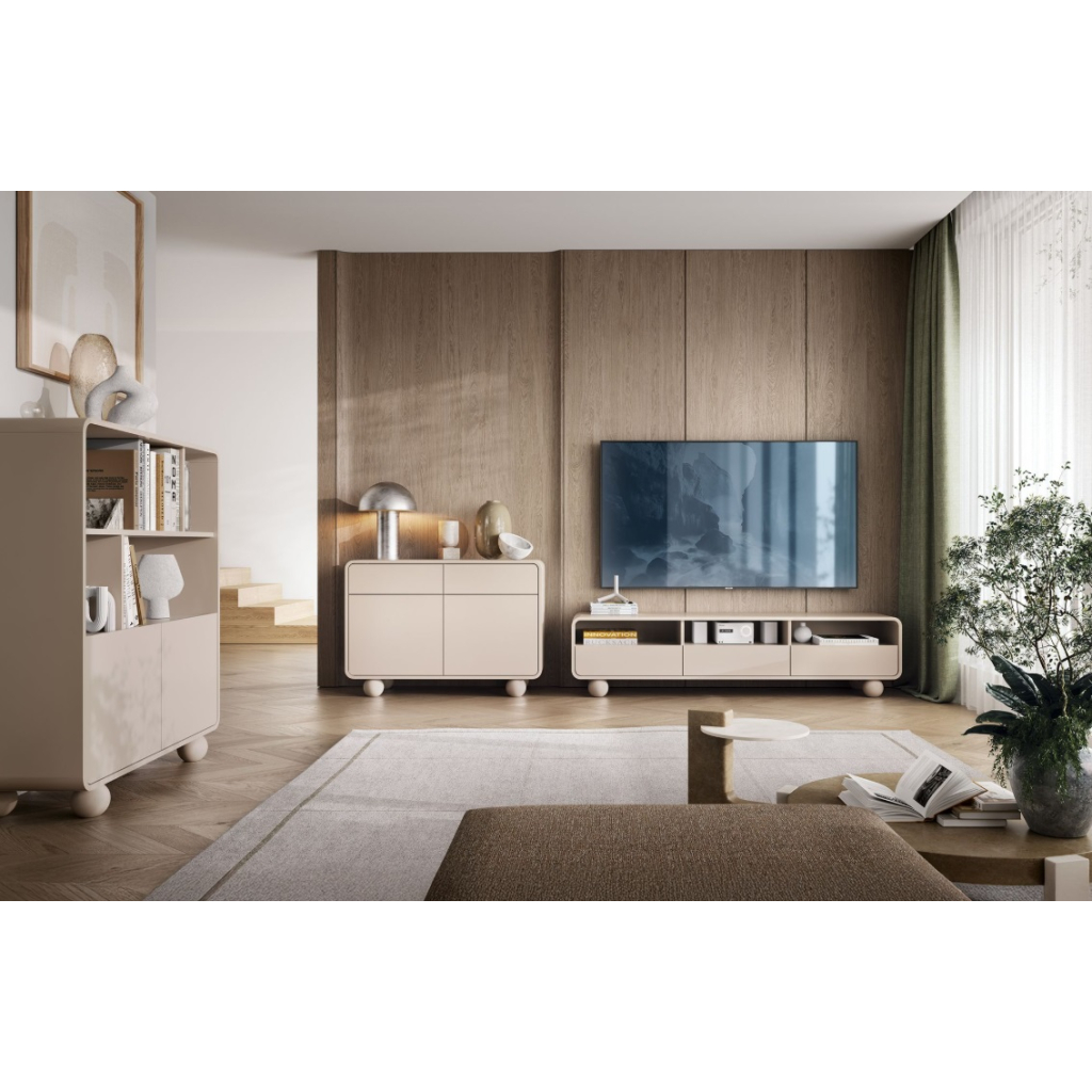 TV stolík NIBAL RTV160 zaujme svojimi jemne zaoblenými tvarmi, ktoré pôsobia elegantne a nadčasovo. Precízne zakrivené hrany dodávajú nábytku harmonický vzhľad a zároveň zvyšujú bezpečnosť pri každodennom používaní. Typickým dizajnovým prvkom sú guľaté nožičky. Povrch v odtieni jemného kašmíru pôsobí príjemne a moderne, vďaka čomu nábytok skvelo zapadne do rôznych interiérových štýlov. Hladké plochy bez úchytiek podporujú jednoduchosť a nenarušenú líniu, zatiaľ čo systém push-to-open umožňuje otváranie zásuviek a dvierok jemným zatlačením, bez potreby klasických úchytiek. TV stolík je priestranný s otvorenými policami s tromi zásuvkami. Taktiež má tri praktické otvory na káble.
