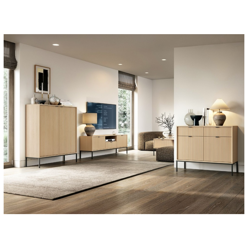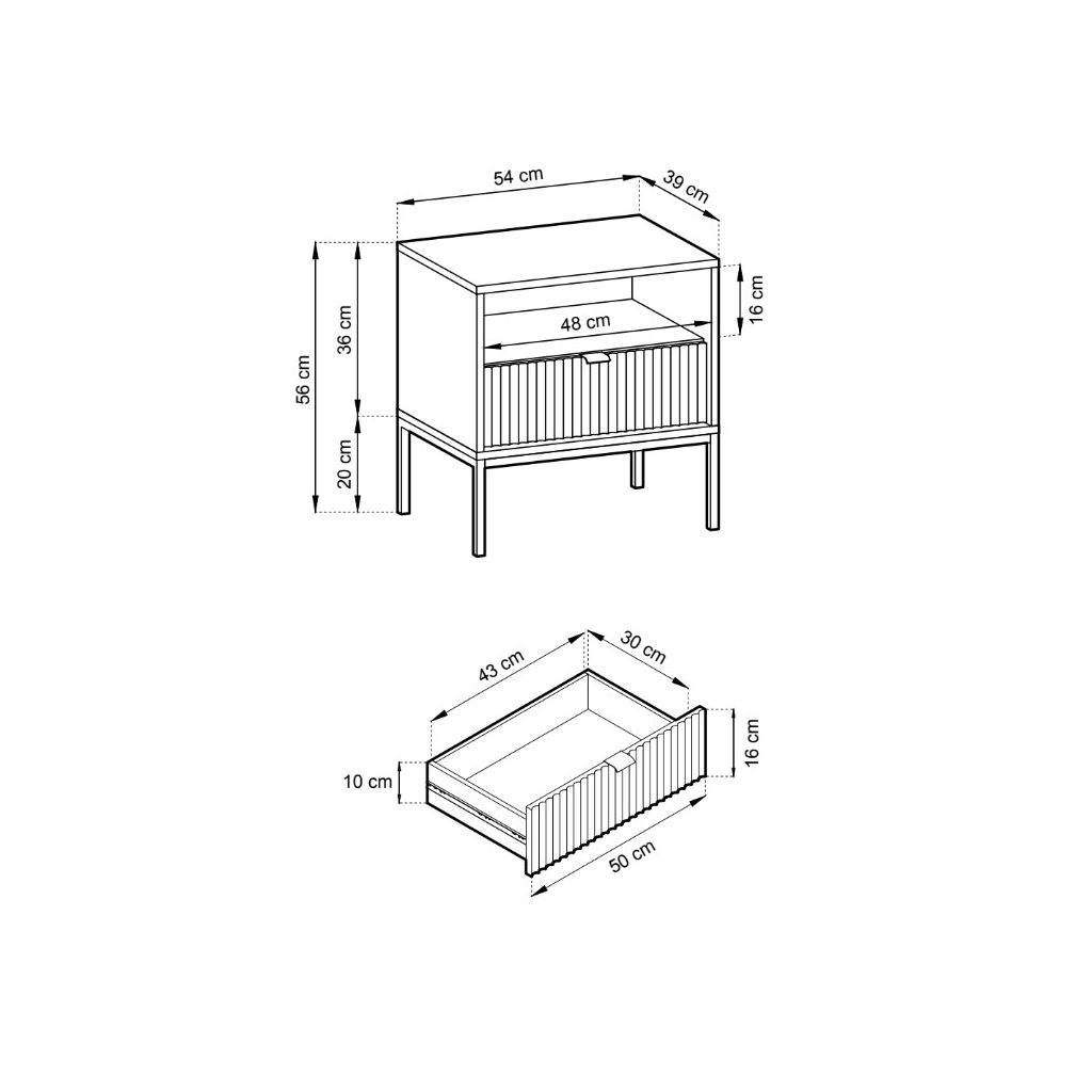 Nočný stolík MONA S-54 má korpus zo 16 mm lamina, dvierka z 18 mm MDF. Nenápadné úchytky v zlatej farbe ho dopĺňajú. Pôsobivý kontrast tvoria čierne nohy z lakovanej ocele s práškovou úpravou. Nábytok má ABS hrany. Čistenie je jednoduché a rýchle – stačí použiť navlhčenú handričku alebo vhodný čistiaci prostriedok na nábytok.