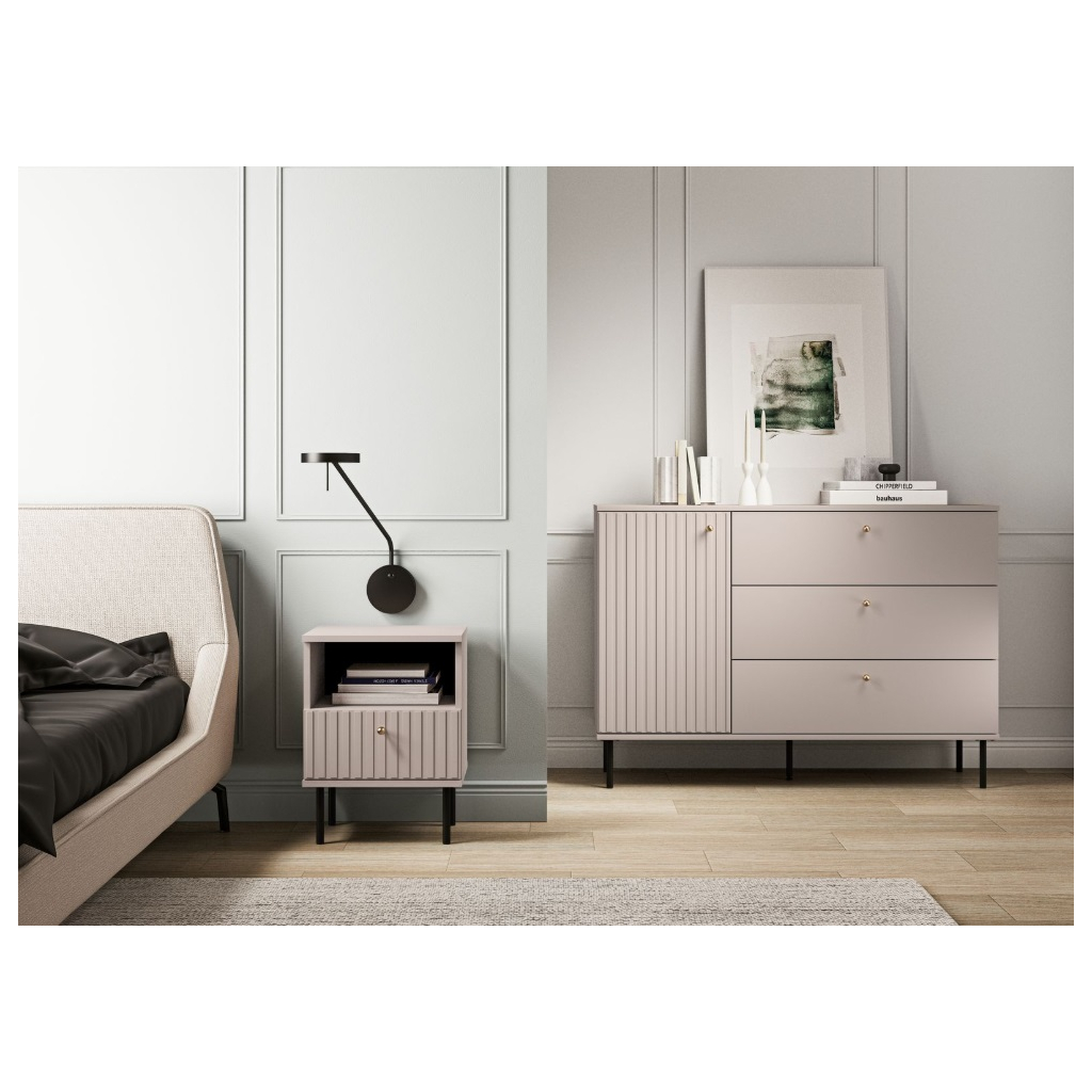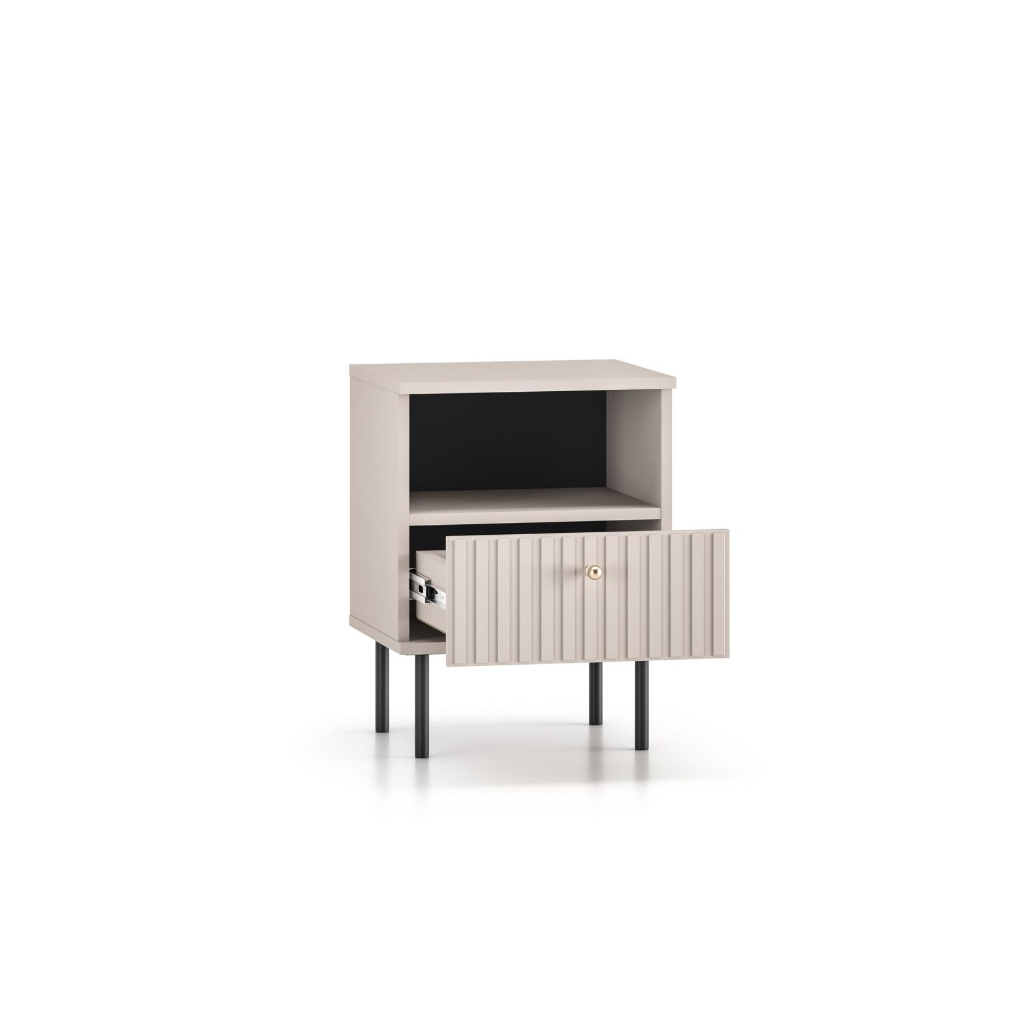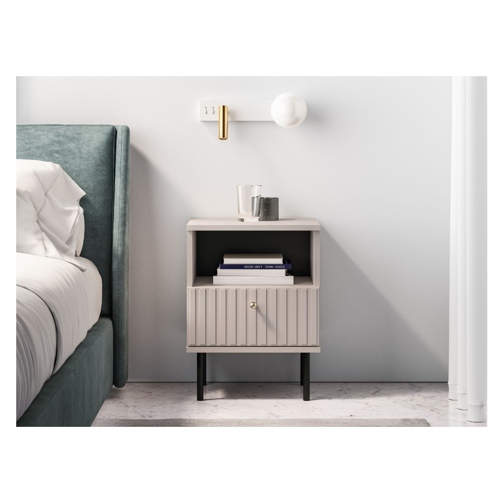 Moderný nočný stolík OLIVIA 24 na vysokých nohách v trendy farbe kašmír oživujú vrúbky na dvierkach. Zvislé vrúbky zdôrazňujú eleganciu a charakter nočného stolíka, dodávajú priestoru textúru a hmatateľnosť, čo vytvára zaujímavý vizuálny kontrast s hladkými povrchmi. Nočný stolík OLIVIA 24 má otvorenú policu a jednu zásuvku. Oceníte plný výsuv zásuviek a ABS hrany. Doprajte si útulný priestor, kde sa budete cítiť pohodlne a doma.