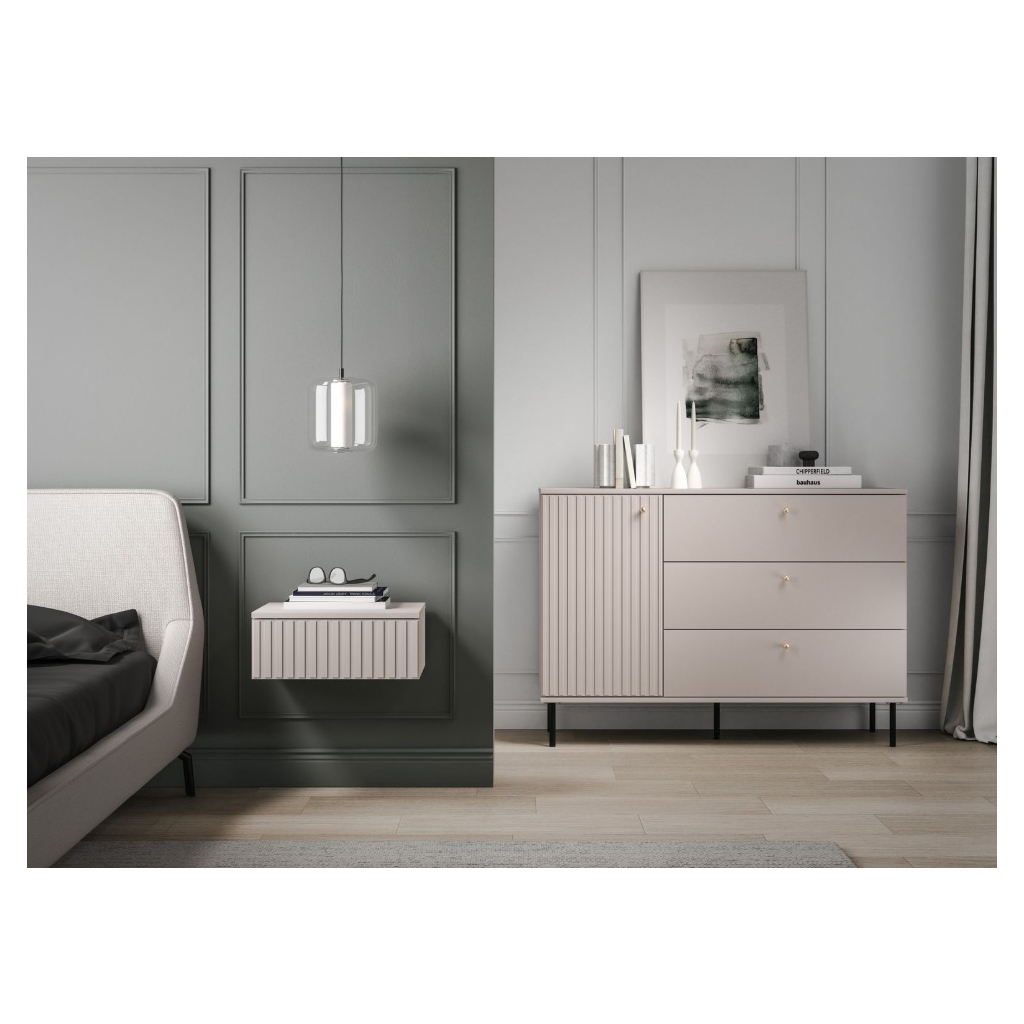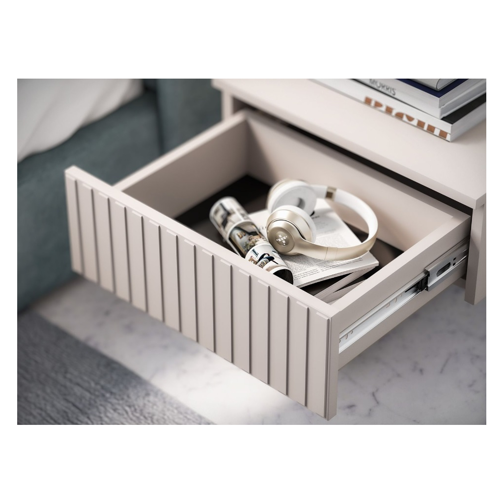Moderný nočný stolík OLIVIA 29 na vysokých nohách v trendy farbe kašmír oživujú vrúbky na dvierkach. Zvislé vrúbky zdôrazňujú eleganciu a charakter nočného stolíka, dodávajú priestoru textúru a hmatateľnosť, čo vytvára zaujímavý vizuálny kontrast s hladkými povrchmi. Nočný stolík OLIVIA 29 má otvorenú policu a jednu zásuvku. Oceníte ABS hrany. Doprajte si útulný priestor, kde sa budete cítiť pohodlne a doma.
