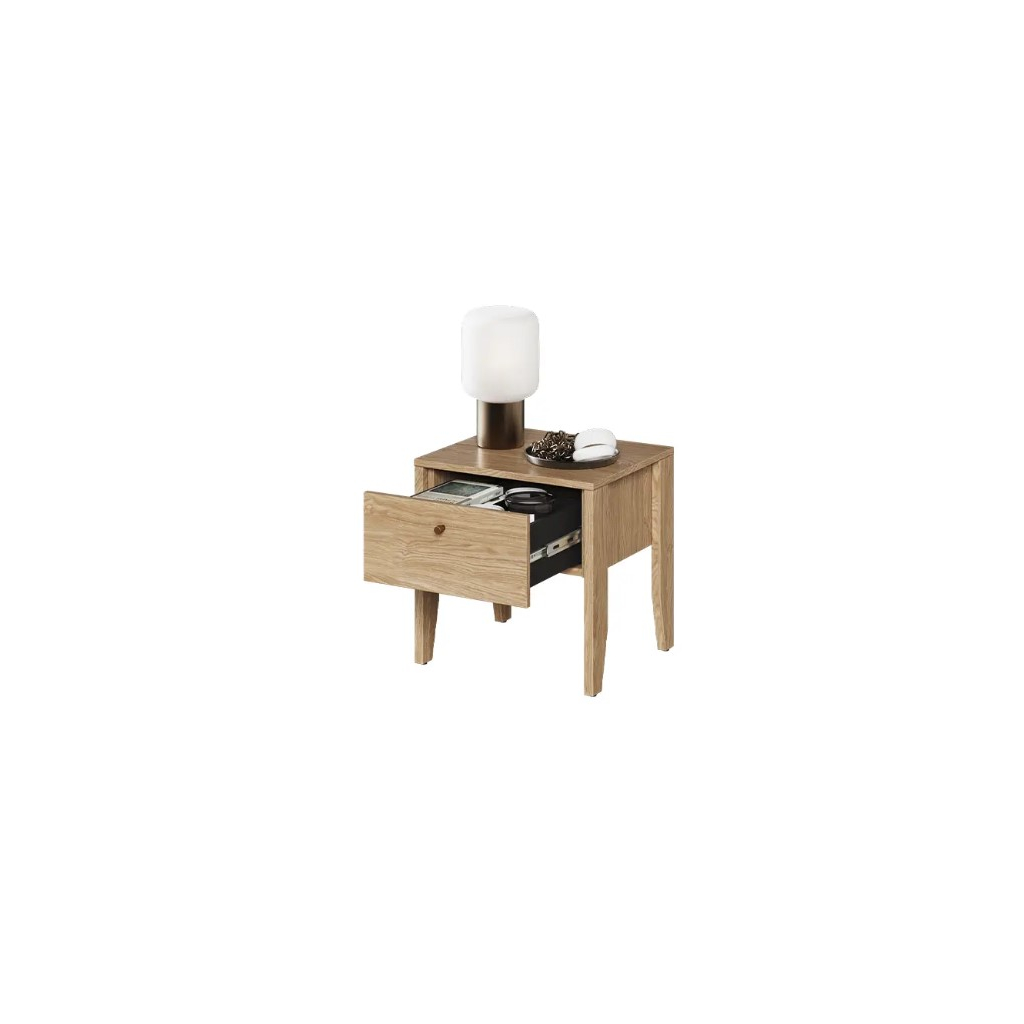 Tento elegantný stolík z kolekcie KORINA spája praktickosť s moderným dizajnom. Hľadáte nábytok, ktorý vám pomôže udržať poriadok a zároveň dodá vašej spálni nádych šarmu? Nočný stolík KORINA CZ-05 je ideálnym riešením. Nočný stolík je priestranný s jednou zásuvkou v príjemnom prevedení olejovaný dub, ktorý dodáva nábytku teplý a prírodný vzhľad.
