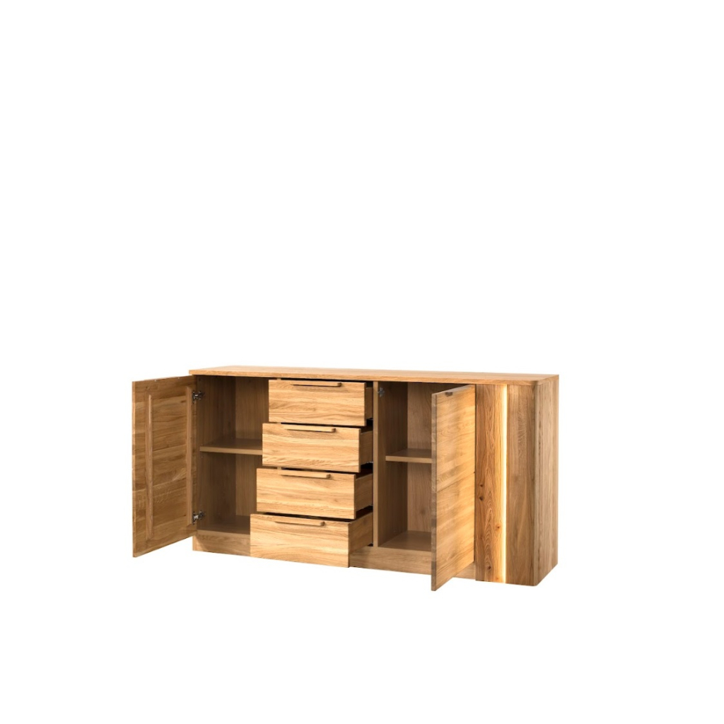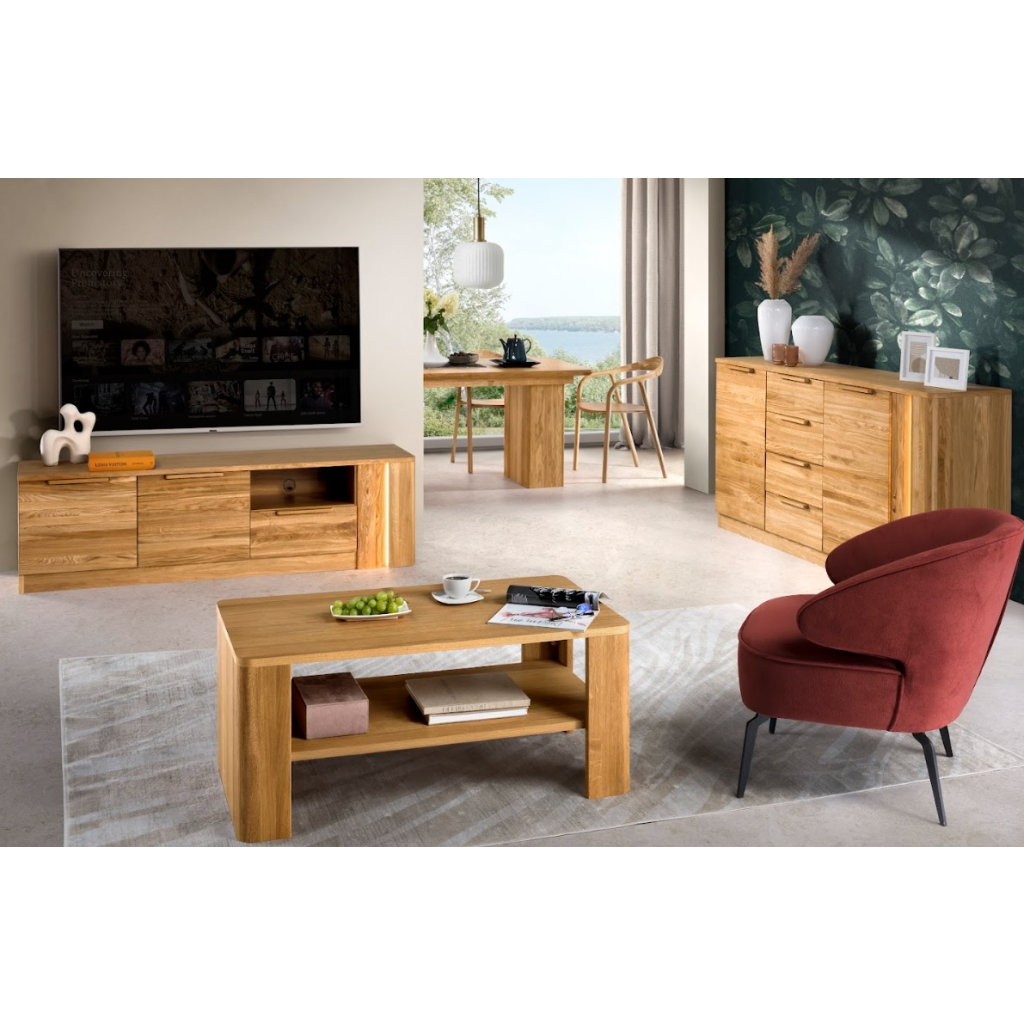 Obývacia stena je vyrobená z kvalitných materiálov, ktoré spájajú prírodnú krásu dreva s praktickosťou moderných povrchov. Vďaka tejto kombinácii pôsobí nábytok elegantne, odolne a nadčasovo. Čelné plochy sú zhotovené z masívneho dubového dreva, ktoré vyniká prirodzenou štruktúrou a teplým odtieňom. Povrch je ošetrený prírodným olejom, ktorý zvýrazňuje kresbu dreva, chráni ho pred vlhkosťou a zachováva jeho autentický vzhľad. Korpus a vnútorné časti sú vyrobené z kvalitnej drevotriesky s odolnou melamínovou a fóliovou povrchovou úpravou. Táto kombinácia zaručuje pevnosť, stabilitu a jednoduchú údržbu, povrch je odolný voči poškriabaniu a každodennému používaniu. Dekoratívne sklenené prvky dodávajú nábytku ľahkosť a moderný vzhľad, čím elegantne dopĺňajú celkový dizajn. Spojenie masívu, drevotriesky a skla prináša dokonalú rovnováhu medzi prírodným štýlom, funkčnosťou a dlhou životnosťou.