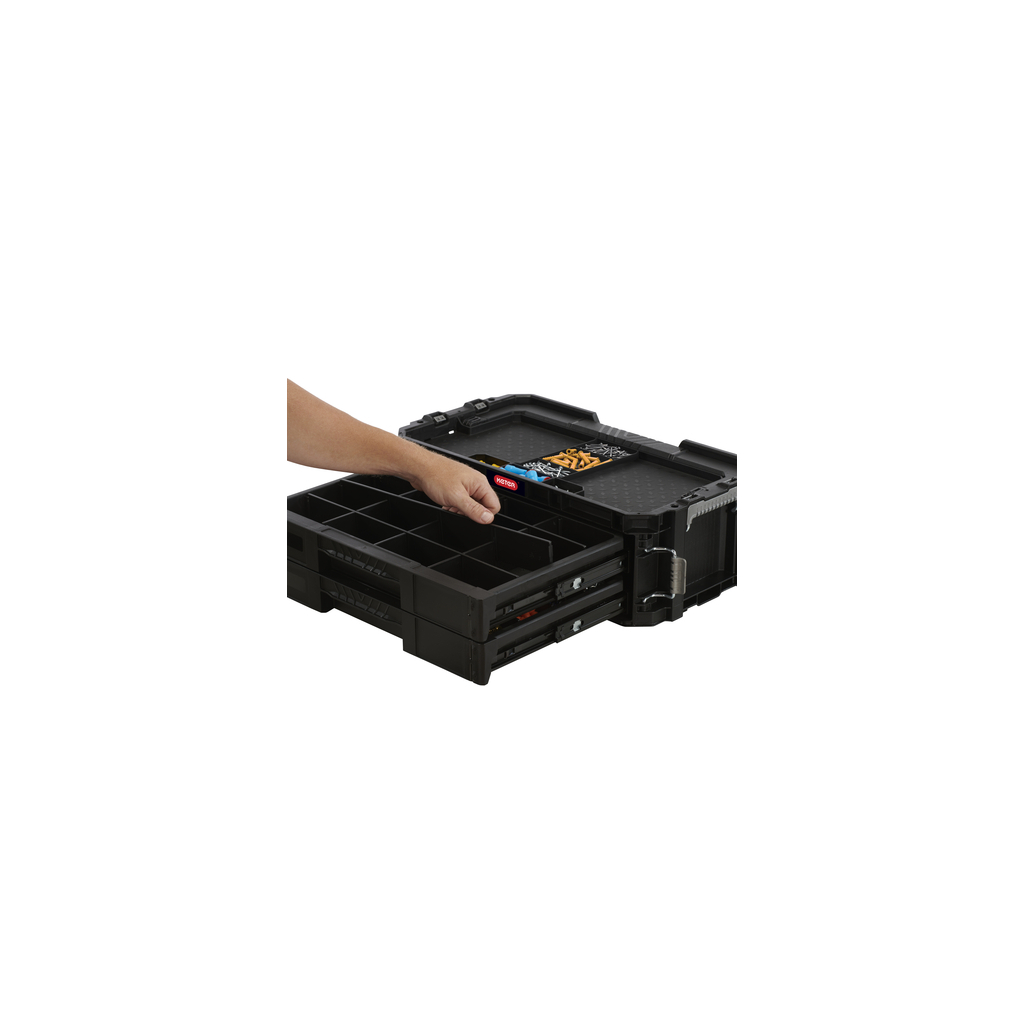 Praktický a priestranný kufor na náradie s 2- zásuvkami v podobe skrinkového systému so zásuvkami zo série Connect predstavuje spoľahlivé riešenie pre každého, kto vyžaduje vysokú kvalitu spracovania a maximálnu funkčnosť. Tento odolný kufor a organizér je určený pre domácich majstrov aj profesionálov. Jeho špeciálne navrhnutá štruktúra zaručuje ergonómiu práce a spoľahlivé používanie aj pri častom prenášaní. Kufor disponuje dvoma priestrannými výsuvnými zásuvkami a praktickou rukoväťou, ktorá umožňuje bezpečné a pohodlné prenášanie. Kovové spony zaistia pevné uzavretie boxu. Jeho obsah sa vám teda nevysype a zostane v bezpečí. Kompatibilita s ostatnými produktmi Connect umožňuje vytvárať prehľadne usporiadané zostavy, ideálne do dielne, garáže či na stavbu.