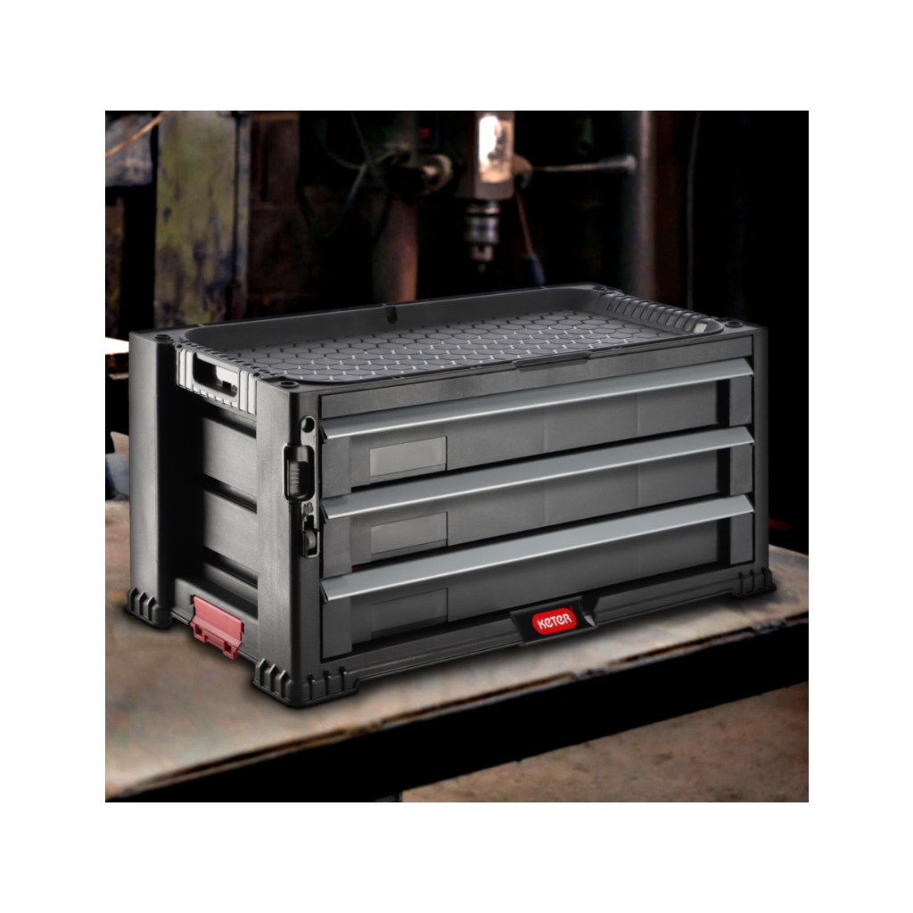 Skrinka s 3 zásuvkami na náradie, príslušenstvo a menšie predmety je ideálna pre každého majstra, ktorý si potrpí na poriadok. Horná praktická polica s priehradkami ponúka dostatok priestoru pre náradie rôznych veľkostí. Súčasťou balenia je 16 vyberateľných boxov, ktoré umožňujú rýchly prístup k drobnému príslušenstvu počas práce. Tri objemné zásuvky zaručujú prehľadné uloženie všetkých potrebných nástrojov a doplnkov. Táto skrinka je výborným pomocníkom do dielne, garáže aj domácej pracovne. Skrinka na náradie disponuje praktickými rúčkami pre jednoduchú prepravu a možnosťou uzavretia na visiaci zámok (nie je súčasťou balenia), čím zvyšuje bezpečnosť uloženého vybavenia. Centrálny zámok uzatvára všetky zásuvky naraz, čo zabezpečuje rýchle a spoľahlivé uzamknutie celého obsahu. Zosilnená konštrukcia s prelismi zaručuje vyššiu odolnosť a dlhú životnosť aj pri intenzívnom používaní.