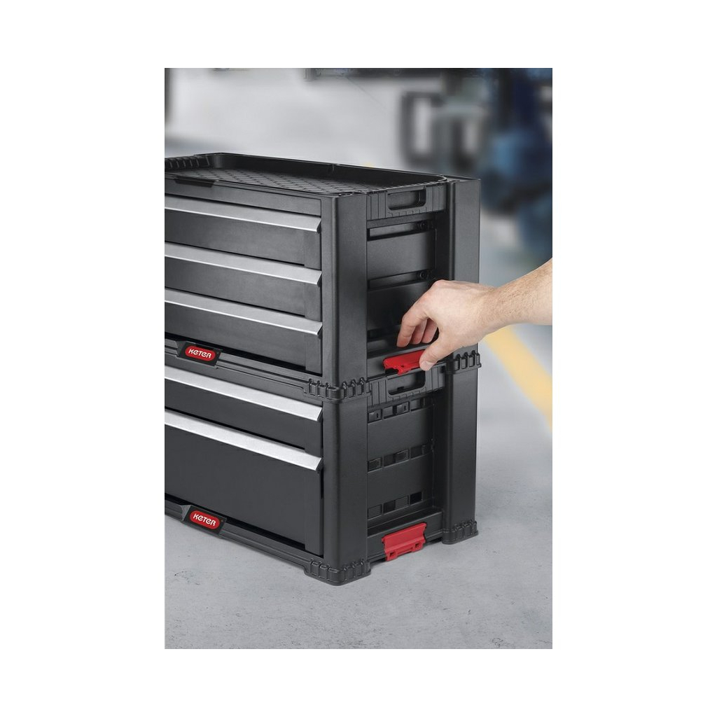 Praktická 5-zásuvková skrinka na náradie na otočných kolieskach je ideálnym riešením pre každého majstra či domáceho kutila. Obsahuje 1 hlbokú zásuvku s vyberateľnými prepážkami, ktorá je ideálna na väčšie a ťažšie náradie. Ďalšie 4 zásuvky poslúžia na menšie nástroje, príslušenstvo a drobnosti. Každá zásuvka obsahuje až 16 vyberateľných boxov, ktoré zabezpečujú prehľadné usporiadanie náradia. Vďaka objemnej polici si jednoducho uložíte nástroje rôznych veľkostí do praktických priehradiek. Robustná konštrukcia, mobilita vďaka kolieskam a organizovaný vnútorný priestor robia z tejto skrinky neoceniteľného pomocníka v dielni, garáži či servise. Skrinka je zložená z dvoch samostatných blokov, ktoré je možné ľahko rozdeliť a používať jednotlivo. Stohovateľné prevedenie umožňuje pridávať a uberať ďalšie skirnky so zásuvkami podľa potreby. Podstavec s kolieskami je možné tiež ľahko odňať. Predné kolieska sú opatrené praktickou brzdou.