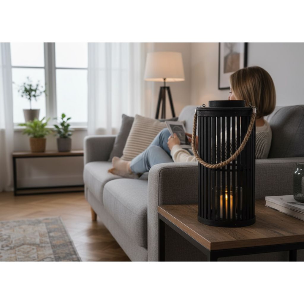 Elegantný veľký drevený lampáš ILS1333 | 40 cm v klasickej čiernej farbe je štýlovou dekoráciou do interiéru aj exteriéru. Vytvára príjemnú a útulnú atmosféru, ktorá dodá každému priestoru jedinečný charakter. Vďaka svojmu výraznému dizajnu sa stane krásnym doplnkom v obývačke, na terase, balkóne alebo v záhrade. Lampáš má praktický kovový úchyt a prírodný povraz umožňujú jednoduché prenášanie alebo zavesenie podľa potreby. Veľký rozmer lampáša navyše zabezpečuje výrazný dekoratívny efekt a krásne zvýrazní sviečku vo vnútri.