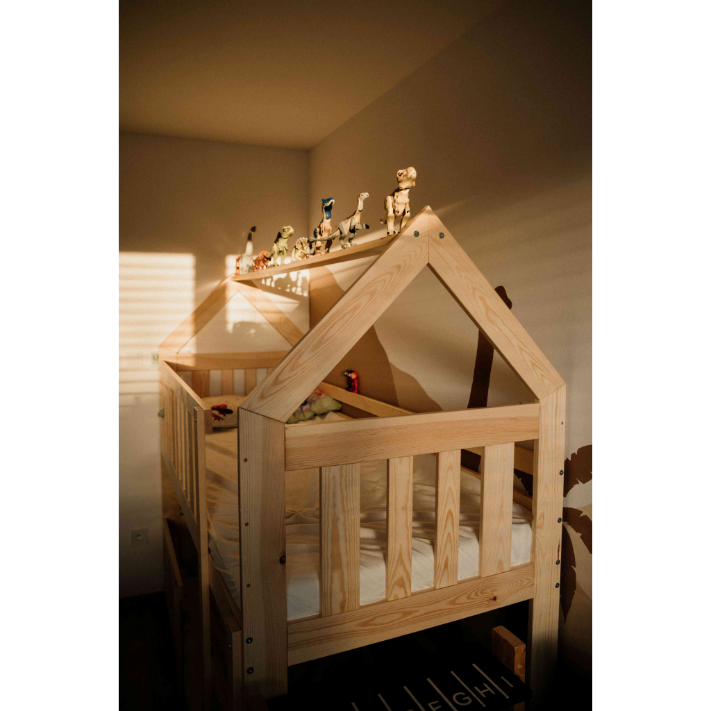 Detská poschodová posteľ TINNY mini v tvare domčeka je nielen praktickým riešením pre menšie priestory, ale aj štýlovým a hravým doplnkom do každej detskej izby. Dizajn v tvare domčeka podporuje kreativitu detí a vytvára pre nich miesto, kde sa môžu hrať, relaxovať a snívať. Borovicové drevo je známe svojou odolnosťou a dlhou životnosťou, je ľahko udržiavateľné a odoláva každodenným nárazom, čo je ideálne pre aktívne deti. Ak hľadáte kvalitnú, estetickú a funkčnú posteľ pre svoje deti, posteľ TINNY mini je ideálnou voľbou pre modernú detskú izbu.